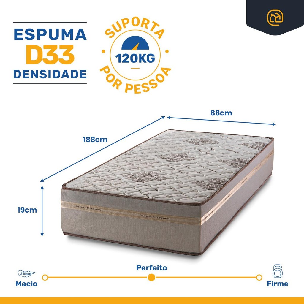 Descubra o equilíbrio perfeito entre conforto e suporte com nosso colchão de espuma D33, revestido com tecido Jacquard e poliéster. Ideal para quem precisa de uma base firme, suportando até 120 kg por pessoa. Modelo ortopédico, o que garante a posição correta para sua coluna durante o seu sono. Com um sistema One Face que elimina a necessidade de virar o colchão, este produto simplifica a manutenção diária. Desfrute de noites tranquilas com um colchão projetado para durabilidade e conforto médio. ESPECIFICÕES TÉCNICAS COLCHÃO: - Matéria prima: Espuma D33/Tecido; - Acabamento: Tecido Jacquard e Poliéster; - Sistema One Face; - EPS Poliestireno Expansível: Possui; - Tipo de conforto: Médio; - Peso máximo recomendado: até 120kg (por pessoa); - Garantia: 12 meses; - Dimensões do produto (largura x comprimento x altura) 88x188x19cm; Importante, as cores podem variar conforme a tela; Não oferecemos montagem; recomendamos profissionais qualificados. Confira as dimensões para transporte em elevadores e passagens. Não transportamos por meios especiais. Por se tratar de um produto de uso íntimo e pessoal, só aceitaremos devoluções por arrependimento apenas se a embalagem do produto não for violada.
