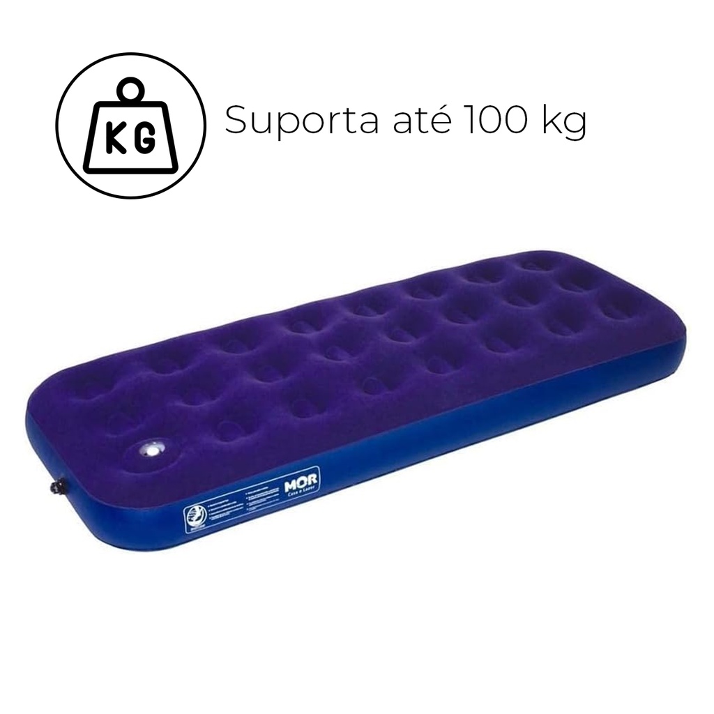 # Auto Equip # Seja bem-vindo(a)!!! O Colchão Inflável Solteiro Mor é produzido em PVC resistente em toda a sua estrutura, conta com um revestimento aveludado na parte superior que torna sua superfície extremamente confortável e facilita a aderência do lençol ou dispensa sua utilização. Além disso, suas ondulações proporcionam o ajuste do corpo, oferecendo um descanso agradável e adequado para diversas situações. O colchão Mor possui inflador acoplado com sistema de fole que facilita seu enchimento de maneira rápida e válvula de enchimento e esvaziamento com sistema de fechamento seguro que evita o vazamento de ar. O colchão multiuso solteiro é perfeito para servir como cama extra para receber suas visitas, acomodar as crianças para brincarem, assistir seus filmes favoritos em qualquer lugar da casa, utilizar em acampamentos ou onde você precisar! Principais Características: - Revestimento Aveludado com Ondulações - Inflador Acoplado com Sistema de Fole - Compacto para Guardar - Proteção contra vazamento - Fácil de Encher e Esvaziar - Cor: Predominante Azul - Capacidade: 1 pessoa - Peso Suportado: 100 kg Aprox. - Composição/Material: PVC - Dimensões aberto: (LxCxA) 22 x 76 x 1,85cm aproximadamente. Conteúdo da embalagem: - 1 Colchão Inflável Solteiro com Inflador Acoplado - Manual de instalação Importante: - Garantia de 3 meses - Pedidos aprovados até 12h enviamos no mesmo dia (seg a sex) - Utilize o campo de “Perguntas e respostas” e esclareça suas dúvidas com nosso suporte técnico