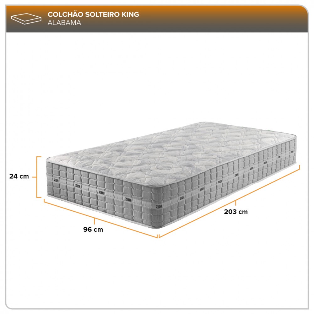 Colchão Solteiro King Molas Ensacadas Alabama 96x203x24cm As molas ensacadas são responsáveis por garantir uma excelente noite de sono. Trata-se de um sistema que opera de maneira individual, sendo independentes umas das outras assegurando assim a longevidade da vida útil do colchão, já que quando alguém se deita, os movimentos ondulatórios são minimamente percebidos, proporcionando um conforto significativo durante o sono. DETALHES EXTERNOS DO COLCHÃO Tipo de Pillow Pillow Flat - Superfície plana, dando um visual mais clean ao colchão. Tipo de Bordado do Tampo Bordado Matelassê: Este método confere volume ao tecido, ampliando a sensação de suavidade e conferindo ao colchão um visual esteticamente agradável. Além de embelezar, ele contribui para uma noite de sono aconchegante e confortável, garantindo bem-estar e uma notável maciez. Tipo do Tecido do Tampo e da Lateral Poliéster - O Poliéster possui vantagens significativas, tais como a grande facilidade para dissipar a umidade e garantir que o colchão seja mais confortável para o sono. É um tecido com alto teor de elasticidade, seu entrelaçamento dá ao produto excelente resistência, beleza e vistosidade, é também um tecido que mantém suas propriedades por mais tempo, não amassa e não perde seu brilho natural. Tratamento dos tecidos Possui um tratamento especial contra ácaros e outras bactérias, prevenindo e evitando crises alérgicas causadas por ácaros presentes na poeira doméstica. No Turn ou No Side O sistema No Turn ou No Side elimina a preocupação de virar seu colchão com frequência. DETALHES INTERNOS DO COLCHÃO Tipo de Estrutura Molas Ensacadas - Produzidas em formato barril, são pré comprimidas e confeccionadas em fio de aço com alto teor de carbono e espessura 2.0. Camadas de Espuma Espuma Densidade D26 - A densidade é a quantidade de matéria-prima utilizada para se fazer um colchão. Quanto maior a densidade, maior o suporte que esse colchão terá a pesos mais elevados. Tipo de Base PR - Uma chapa laminada (especial) de poliestireno com função de fornecer suporte base de apoio para sustentar o colchão. Outras Características Internas Polyframe - Sistema usado nos colchões de molas, composto por um quadro que envolve com borda de espuma de alto suporte (D26) em toda a lateral do colchão. + Suporte de peso ideal de até 120 kg por pessoa. + Possui o nível intermediário de conforto. + Produto aprovado pelo Inmetro com certificação de alta qualidade dentro dos padrões para exportação. + Produto ecológico é todo aquele que seja não poluente, não tóxico, notadamente benéfico ao meio ambiente e a saúde, contribuindo para o desenvolvimento de um modelo econômico e social sustentável. + Até 1 (um) ano de garantia, oferecida pelo fabricante. + Produto de excelente qualidade e excelente acabamento, produto com muita presença, com conforto intermediário, possui também tecido de boa qualidade em seu tampo, em resumo um produto de ótima qualidade por todo o seu composto e por seu excelente custo-benefício. + Em nossa qualificação com nota de 1 a 10, qualificamos este produto com nota 8. Produto não acompanha base box. Imagens meramente ilustrativas. O produto pode ter pequenas variações de cores a depender da tela de visualização. Em caso de devolução, o produto deve ser devolvido em sua embalagem original e sem sinais de uso. A entrega do produto é realizada por transportadora, não subimos escadas ou elevadores com o produto. Não inclui serviço de montagem. Dimensões Altura: 24 cm Largura: 96 cm Profundidade: 203 cm Peso: 15,250 kg