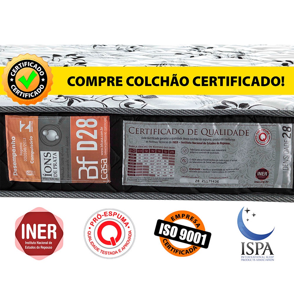 Desenvolvido para melhorar a qualidade do seu sono, o colchão D28 da indústria BF Colchões, feito com 100% espuma certificada, conforto intermediário e um toque macio, proporciona noites mais tranquilas e restauradoras. Com tratamento antimicrobiano, este colchão é ideal para um ambiente de sono saudável. Suporte de Peso: Até 90 Kg por pessoa. Nível de Conforto: Intermediário-macio Densidade: Espuma D28 Certificada Dupla Face: Use dos dois lados Qualidade e conforto garantidos Este nível de conforto é perfeito para quem pesa até 90 Kg e busca a sustentação ortopédica, ideal para o alinhamento da coluna, mas um toque macio que alivia os pontos de pressão, como ombros e quadril, favorecendo qualquer posição do sono. Tratamento antimicrobiano O tecido passa por um tratamento especial com um agente antimicrobiano que elimina bactérias, ácaros e outros agentes alérgenos que entram em contato com a fibra, para um ambiente de sono muito mais saudável. Certificações que você pode confiar Nosso compromisso com a qualidade é reconhecido com as certificações nacionais e internacionais mais importantes do setor de colchões. Recebemos o selo Pró-Espuma, concedido a fabricantes que atendem aos rigorosos requisitos do INER, uma referência nacional por meio do Instituto Falcão Bauer, para manter o mais alto padrão de qualidade; ISO 9001, INMETRO e ABICOL, que garantem a segurança e excelência dos nossos produtos; e ISPA (International Sleep Products Association), que certifica nossos colchões com os mais altos padrões de qualidade internacionais. Quem é a BF Colchões? Para nós, dormir bem é a base de uma vida plena de sonhos e qualidade de vida. Com mais de 55 anos de experiência e mais de 900 colaboradores, somos pioneiros na venda online de colchões, nos tornando a marca mais vendida e bem avaliada da internet, melhorando a qualidade do sono de milhares de brasileiros. Cuidamos de toda a produção — desde a fabricação da espuma até o último detalhe — com design, engenharia e cuidado em cada colchão. Em nosso laboratório próprio, desenvolvemos e testamos todas as nossas espumas para entregar o maior conforto, durabilidade e o melhor custo-benefício do mercado e garantir a satisfação de milhares de clientes em todo o país. Nosso propósito é muito claro: queremos contribuir para uma vida e um mundo em equilíbrio através do sono de qualidade. Afinal, a qualidade do seu descanso começa no colchão. Por aqui, trabalhamos incansavelmente para que cada colchão seja um refúgio que convida você ao descanso e te leva de volta à sua zona de conforto, recarregando suas energias para enfrentar mais um dia de trabalho e realização de sonhos. Prazer, somos a BF Colchões. Sustentabilidade em cada produto Somos uma indústria alinhada com os Objetivos de Desenvolvimento Sustentável (ODS) da ONU. Adotamos práticas que minimizam o impacto ambiental e promovem um futuro mais saudável, desde a seleção cuidadosa de matérias-primas, fornecedores, até processos produtivos mais eficientes e responsáveis, contribuindo para um mundo cada vez mais sustentável. Características: Tamanho: Viúva (14cm x 128cm x 188cm - Altura x Largura x Comprimento). Suporte de Peso: Até 90 Kg por pessoa. Nível de Conforto: Intermediário-macio. Espuma de Densidade 28: Espuma selada e testada em laboratório para certificar sua durabilidade. Revestimento superior: 100% poliéster, durável e resistente. Garantia: 01 ano. Marca: BF Colchões. Atenção a entrega: Não fazemos entregas em estrada de terra, ou barco. Não subimos produtos por escadas e elevadores.