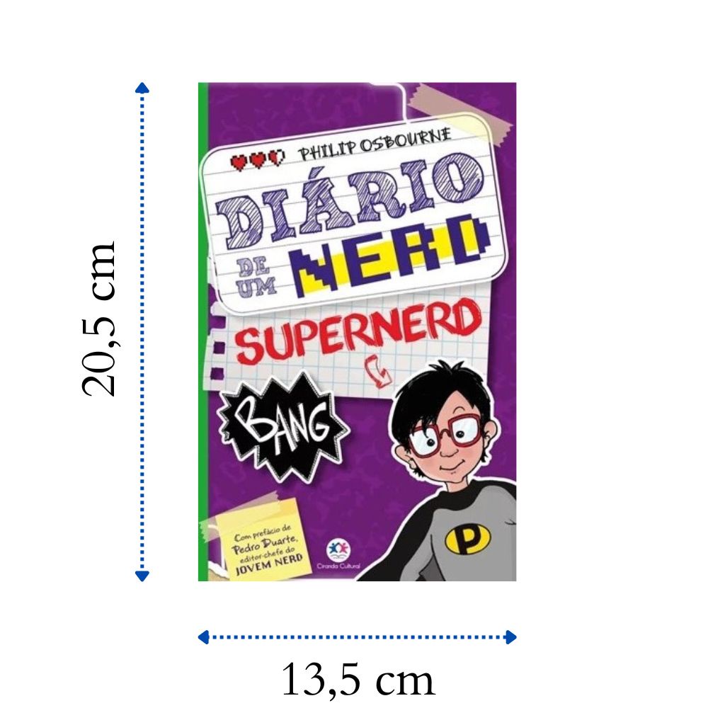 A Coleção Diário de um Nerd é voltada para o público infanto juvenil de 8 a 12 anos, com ilustrações especias para a garotada a coleção garante horas de entretenimento. Com 3 títulos, sendo: Volume 1 Phil, o nerd, é um garoto de 12 anos muito inteligente que adora estar com os amigos. Ele e sua turma precisam se preparar para competir nas Olimpíadas de Matemática e Ciências. Mas, para tentar conquistar a garota dos seus sonhos, Phil começa a viver uma vida secreta de campeão esportista. Em meio a todas as mentiras, será que Phil conseguirá conciliar as duas realidades? Volume 2 Phil, o Nerd, se prepara com seus amigos para viajar para Hollywood, onde vai conhecer os estúdios de clássicos do cinema e participar de um programa de talentos da TV. Mas seu novo professor, que odeia nerds, está disposto a acabar com a fama de nerd de Phil. Será que ele conseguirá vencer o programa de talentos e convencer o professor de que os nerds são legais? Volume 3 Phil, o nerd, nunca pensou que um dia se tornaria um super-herói de verdade. Quando um terrível vilão sequestra os roteiristas das séries de TV, Phil é o único que pode resgatá-los. Agora, o Supernerd precisa arriscar sua vida para salvar o futuro de suas séries preferidas. Acabamento: Brochura Páginas por livro: 160 Peso por livro: 145 Gramas Altura, Largura, Profundidade por livro: 1 cm, 13,5 cm, 20,5 cm
