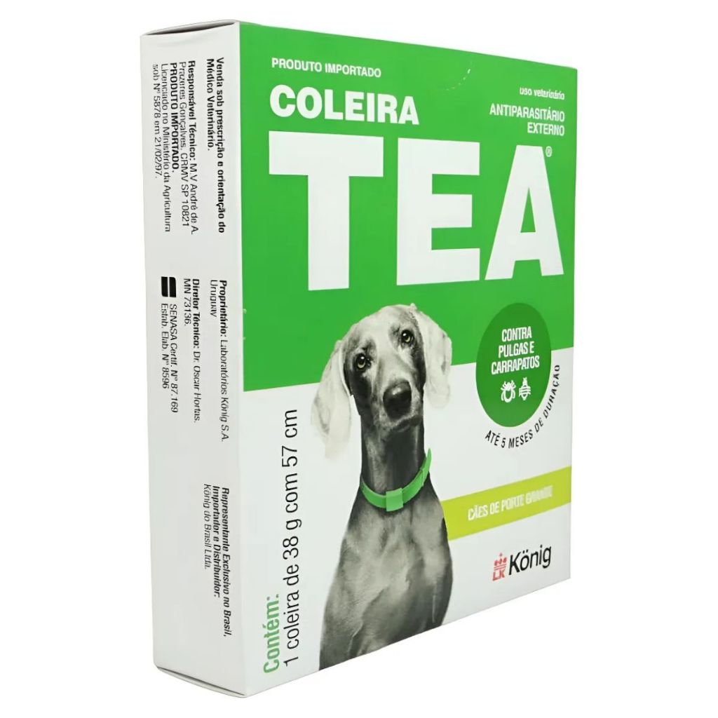 Coleira Antipulgas e Carrapatos Tea 327 Konig - Proteção Completa A Coleira Tea 327 é referência em custo-benefício e eficácia para o controle de parasitas. Com uma tecnologia exclusiva de matriz plástica, ela libera o princípio ativo em forma de pó fino, garantindo que o seu pet fique protegido sem que o pelo fique oleoso ou com cheiro forte. ✨ Diferenciais da Tea 327 Fórmula Atóxica: Segurança para o seu pet e para sua família. Tecnologia de Liberação Gradual: O ativo (Propoxur) é liberado através do movimento, garantindo proteção por até 5 meses. Pelo Sempre Limpo: Não deixa resíduos gordurosos, mantendo a pelagem sedosa e seca. Segura para Filhotes: Pode ser utilizada precocemente em cães e gatos a partir de 6 semanas de vida. Eficácia por Contato: Elimina os parasitas assim que eles encostam no animal, sem necessidade de picada. 📏 Escolha o Tamanho Ideal para seu Pet A Coleira Tea 327 possui apresentações específicas para cada porte: IndicaçãoPesoComprimentoGatos13g33 cmFilhotes de Cães13g33 cmCães Pequenos e Médios28g44 cmCães Grandes38g57 cm🧪 Composição e Ação Princípio Ativo: Propoxur (10,00g por cada 100g). Pico de Ação: O controle máximo é atingido entre o 1º e 2º mês de uso. Observação: A coleira atua na eliminação dos parasitas no animal; para melhores resultados, recomenda-se também o tratamento do ambiente. 🛠️ Modo de Uso e Dicas de Durabilidade Ajuste Correto: Coloque a coleira no pescoço do pet, deixando sempre a folga de dois dedos. Isso permite que a coleira se movimente e libere o ativo corretamente. Corte o Excesso: Após ajustar, corte a sobra da coleira. Resistência: A coleira não perde o efeito se molhada (chuva), mas para maior durabilidade, remova-a durante o banho e recoloque quando o animal estiver seco. 📋 Informações Adicionais Garantia de fábrica: 15 dias. Uso Veterinário: Antes de aplicar, leia a bula. A durabilidade de 5 meses pode variar conforme a frequência de banhos e o nível de infestação do ambiente.