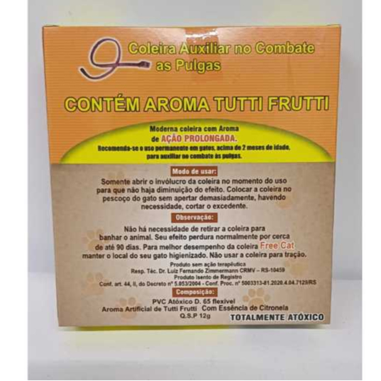 Coleira anti pulgas free cat desenvolvida especialmente para gatos adultos este produto é 100% ATÓXICO. REPELENTE ERVAS NATURAIS Recomenda-se o uso permanente em gatos para auxiliar no combate as pulgas.A coleira para gatos pode ser usada a partir do 3° mês de vida. Nã há necessidade de retirar a coleira na hora de banhar o pet. Seu efeito perdura normalmente por cerca de até 90 dias. para melhor desempenho da coleira, manter o local onde fica seu pet bem higienizado.Modo de Usar:Somente abrir a embalagem da coleira no momento do uso para assim, potencializar o efeito. Colocar a coleira no pescoço do gato sem apertar demasiadamente. Havendo necessidade, cortar o excedente.Composição: PVC Atóxico D.65 Flexível Aroma Artificial de Tutti Frutti Extrato de Ervas Naturais.36 cm comprimento Duração: 3 meses