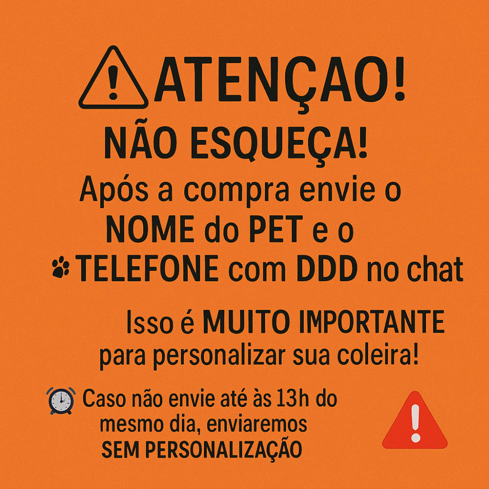 Coleira para Cachorro YooPets Modelo sem Fecho ATENÇÃO LEIA A DESCRIÇÃO: **APÓS EFETUAR A COMPRA, ENTRAR EM CONTATO PELO CHAT PARA ENVIAR OS DADOS DE PERSONALIZAÇÃO** **A COLEIRA NÃO SERVE PARA USAR COMO GUIA, APENAS PARA IDENTIFICAÇÃO** **OS DADOS INFORMADOS SERÃO USADOS APENAS PARA A REALIZAÇÃO DA PERSONALIZAÇÃO DO PRODUTO** As informações não apagam, trazendo mais segurança para seu pet. - Confortável e Resistente - Fabricada em material durável, macio e ajustável, garantindo conforto para cachorros no uso diário. - Produto novo, personalizado e com envio rápido. (Pronta Entrega) - A coleira da YooPets visa o conforto, resistência e identificação para o pet. Descrição Técnica: Coleira: - Fitas de Elástano (Anti Alérgicas e Elásticas), produto leve, resistente com ajuste fácil e confortável - Placa de Identificação (As informações não apagam, trazendo mais segurança para seu pet.) - Argola para a Placa de Identificação - Placa identificação Alumínio - Coleira elástica Placa de Identificação - Tag de Ossinho alumínio com Gravação profunda - A Personalização é a laser e grátis: Nome na frente e 2 números de Telefone ou 1 Telefone + Nome do Tutor(a) - Identificação Segura - Não enferruja Tamanhos: PP Largura da Fita: 1,25 cm Regulagem no Pescoço: 16 cm a 29 cm Plaquinha: 2,8 cm x 1,80 cm P Largura da Fita: 1,8 cm Regulagem no Pescoço: 22 cm a 35 cm Plaquinha: 3,8 cm x 2,5 cm M Largura da Fita: 1,8 cm Regulagem no Pescoço: 27 cm a 45 cm Plaquinha: 3,8 cm x 2,5 cm G Largura da Fita: 1,8 cm Regulagem no Pescoço: 32 cm a 55 cm Plaquinha: 3,8 cm x 2,5 cm GG Largura da Fita: 1,8cm Regulagem no Pescoço: 37 cm a 67 cm Plaquinha: 3,8 cm x 2,5 cm