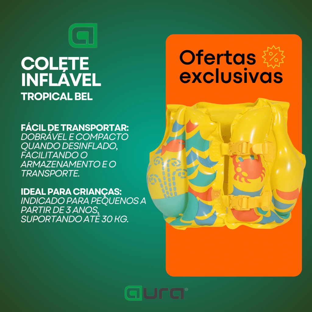 Colete Inflável Tropical Bel – Segurança e Diversão para os Pequenos O Colete Inflável Tropical Bel é a opção ideal para proporcionar mais segurança e conforto às crianças durante as atividades aquáticas. Desenvolvido com material resistente e design ergonômico, ele permite liberdade de movimentos sem comprometer a proteção. Perfeito para momentos de lazer na piscina, praia ou clube. Por que escolher o Colete Inflável Tropical? Mais Segurança: Possui válvula de segurança, duas câmaras de ar e fivelas ajustáveis com engate rápido. Conforto e Mobilidade: Design ergonômico que não restringe os movimentos da criança na água. Resistente e Durável: Fabricado em vinil pré-testado, garantindo mais qualidade e segurança. Fácil de Transportar: Dobrável e compacto quando desinflado, facilitando o armazenamento e o transporte. Ideal para Crianças: Indicado para pequenos a partir de 3 anos, suportando até 30 kg. Especificações Técnicas Material: Vinil pré-testado Modelo: Colete inflável Dimensões montado: 41 cm (C) x 30 cm (L) Peso máximo suportado: 30 kg Itens Inclusos: 1 Colete Inflável Tropical Garanta já o Colete Inflável Tropical Bel e proporcione mais segurança e diversão para as crianças nas atividades aquáticas.
