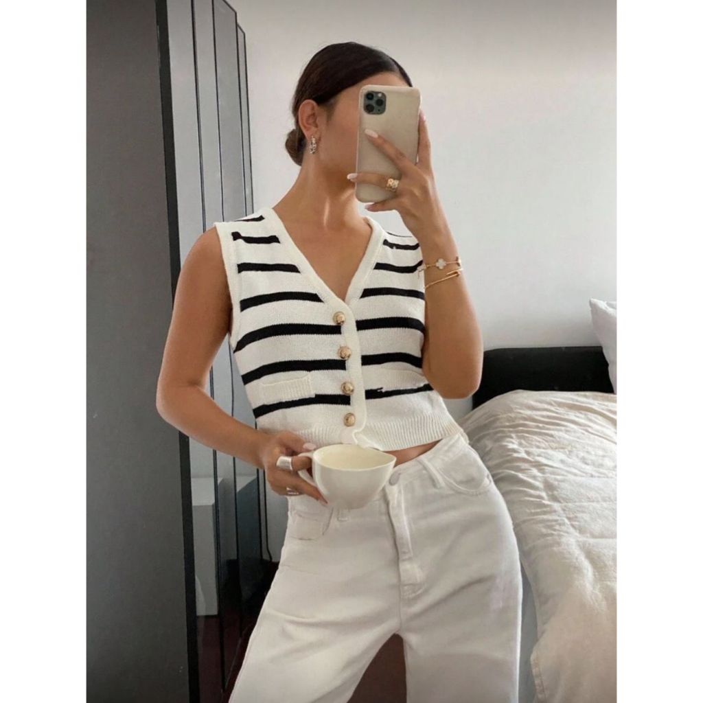 Colete Botão Blusa Tricot Feminina Moda Blogueira Curto decote V Listrado