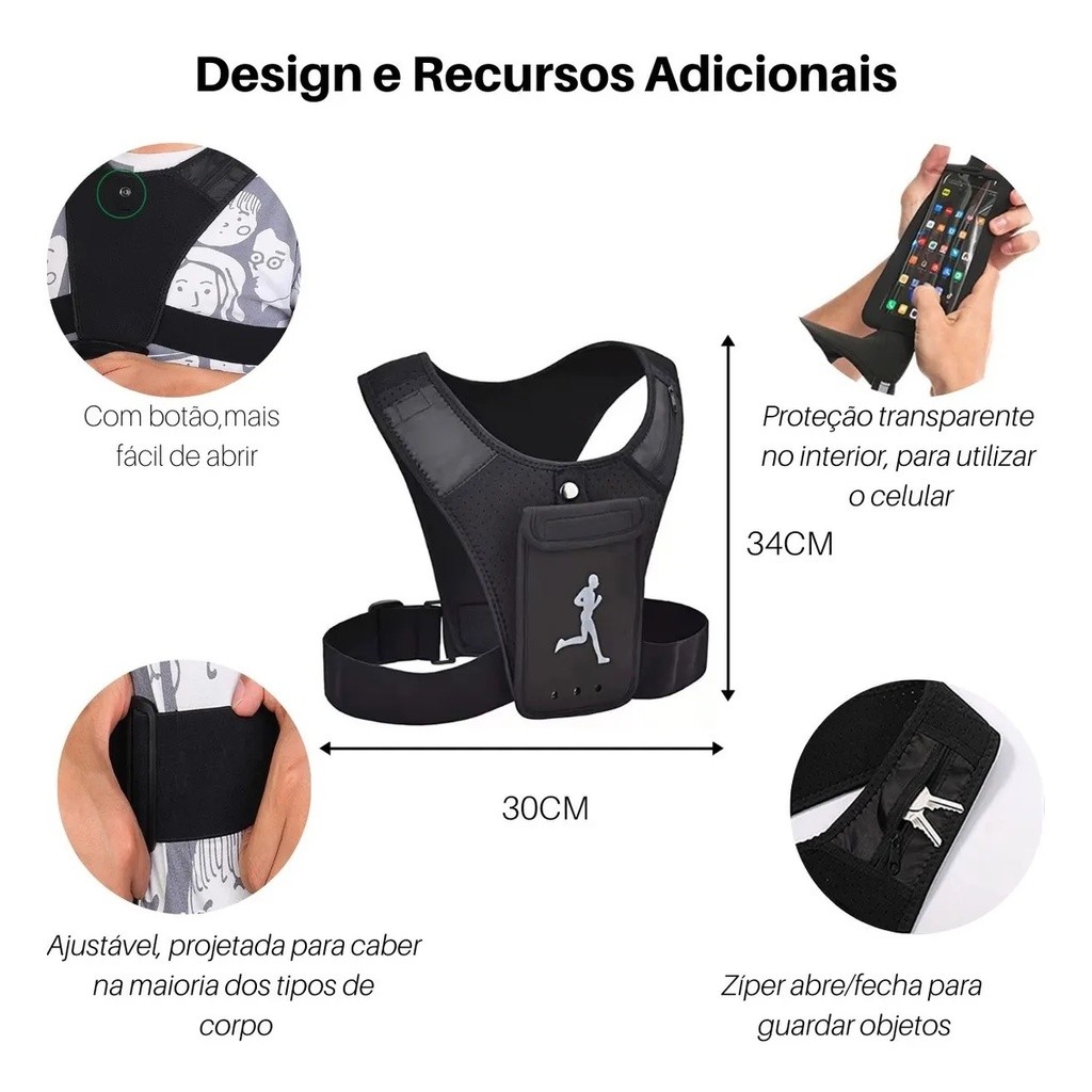 Colete para exercicios e caminhadas, auxiliando no transporte do celular, chaves e cartões. ele ainda pode ser utilizado em viagens para armazenar o passaporte, assim evitando perda ou furto do mesmo. O produto é leve e super confortavel. DADOS TÉCNICOS DO PRODUTO: MODELO: Esporte Leve COMPOSIÇÃO: Políester; TAMANHO: Único; MEDIDAS: 30cm x 34cm CINTURA AJUSTÁVEL: 60cm até 130cm; PESO: 160g OUTRAS CARACTERÍSTICAS: Lavável, impermeável e reutilizável;