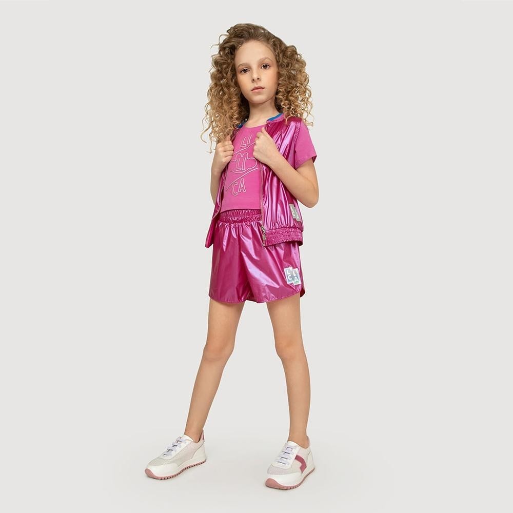 Colete para menina confeccionado em tecido de poliamida com glow. Perfeito para garantir um visual superestiloso, possui gola em retilíneo listrado, abertura em zíper, elástico na cintura, etiqueta holográfica exclusiva da marca e efeito brilhante em toda a peça. Aposte! Sua pequena vai arrasar! • Colete • Abertura em zíper • Etiqueta holográfica • Efeito brilhante • Tecido de poliamida com glow