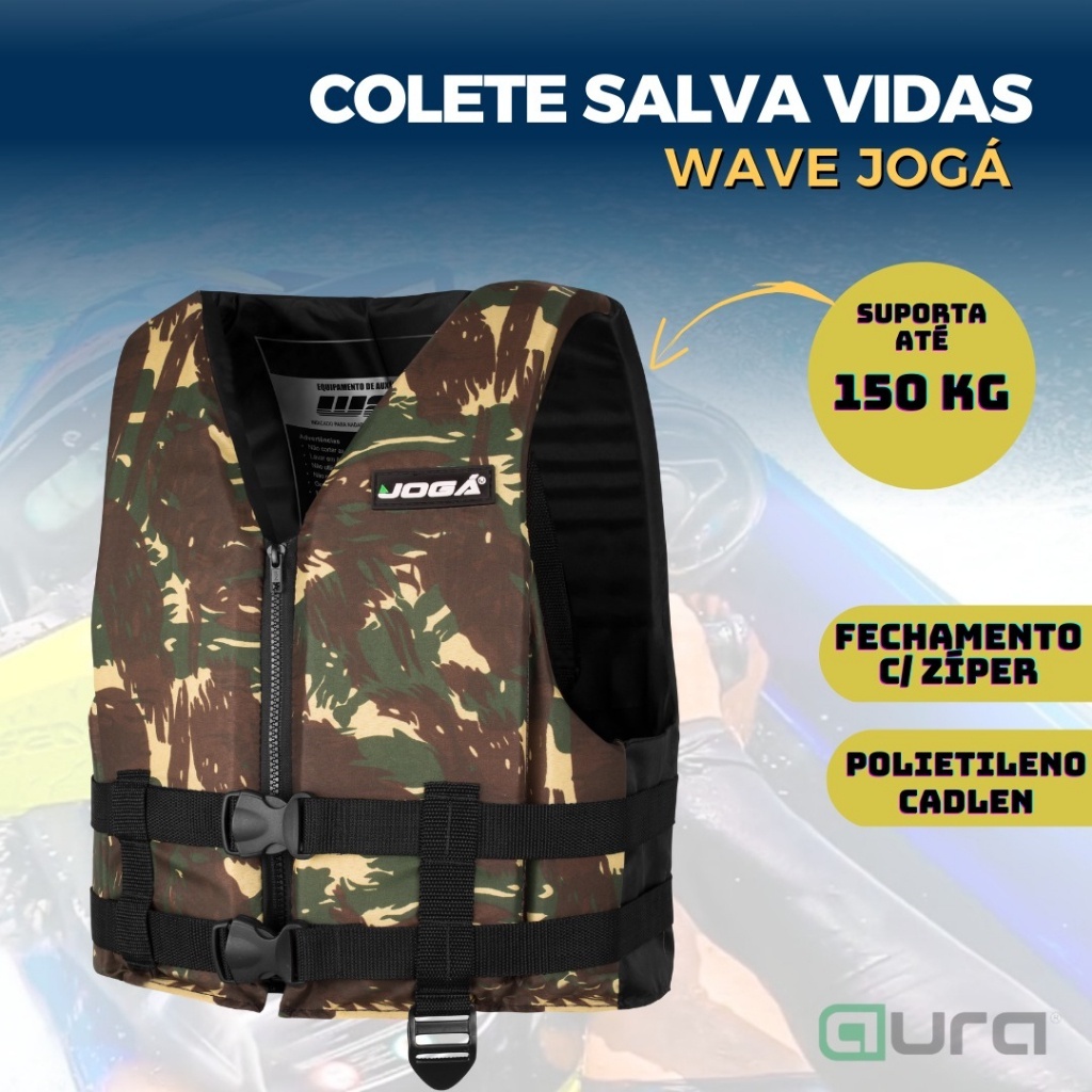 Colete Salva Vidas Wave Jogá Cor Camuflado Os Coletes Salva Vidas são itens indispensável e de porte obrigatório, mas além da obrigatoriedade, são totalmente viáveis para sua segurança e sobrevivência em caso de alguma queda na água ou naufrágio. A Jogá marca nacional vem se destacando no mercado pela grande qualidade nos seus produtos, desenvolveu a linha de Coletes Salva Vidas Wave, um equipamento com alto poder de flutuação, desenvolvido totalmente com matérias-primas nacionais. Fechamento frontal com zíper, 2 correias de segurança para ajustes ao corpo, E uma vertical para ajuste pela perna. E Compartimento interno para guardar a tira quando não estiver em uso. O Colete Salva Vidas Wave é fabricado com material Cadlen de alta flutuabilidade. O Cadlen é uma manta de espuma flexível muito utilizada em coletes salva-vidas Obs.: Colete não Homologado! ESPECIFICAÇÕES: - Cor: Camuflado; - Material de fabricação: Polietileno Cadlen - Peso Suportado conforme o tamanho selecionado. A REFERENCIA D0 TAMANHO DO COLETE E PELO PESO CORPORAL DA PESSOA.