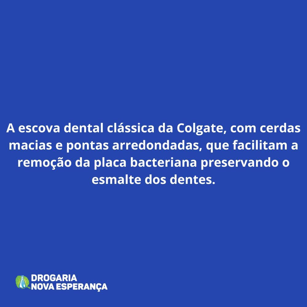 Colgate Escova Dental Clássica é um produto que apresenta: - A escova dental clássica da Colgate, com cerdas macias e pontas arredondadas, que facilitam a remoção da placa bacteriana preservando o esmalte dos dentes.