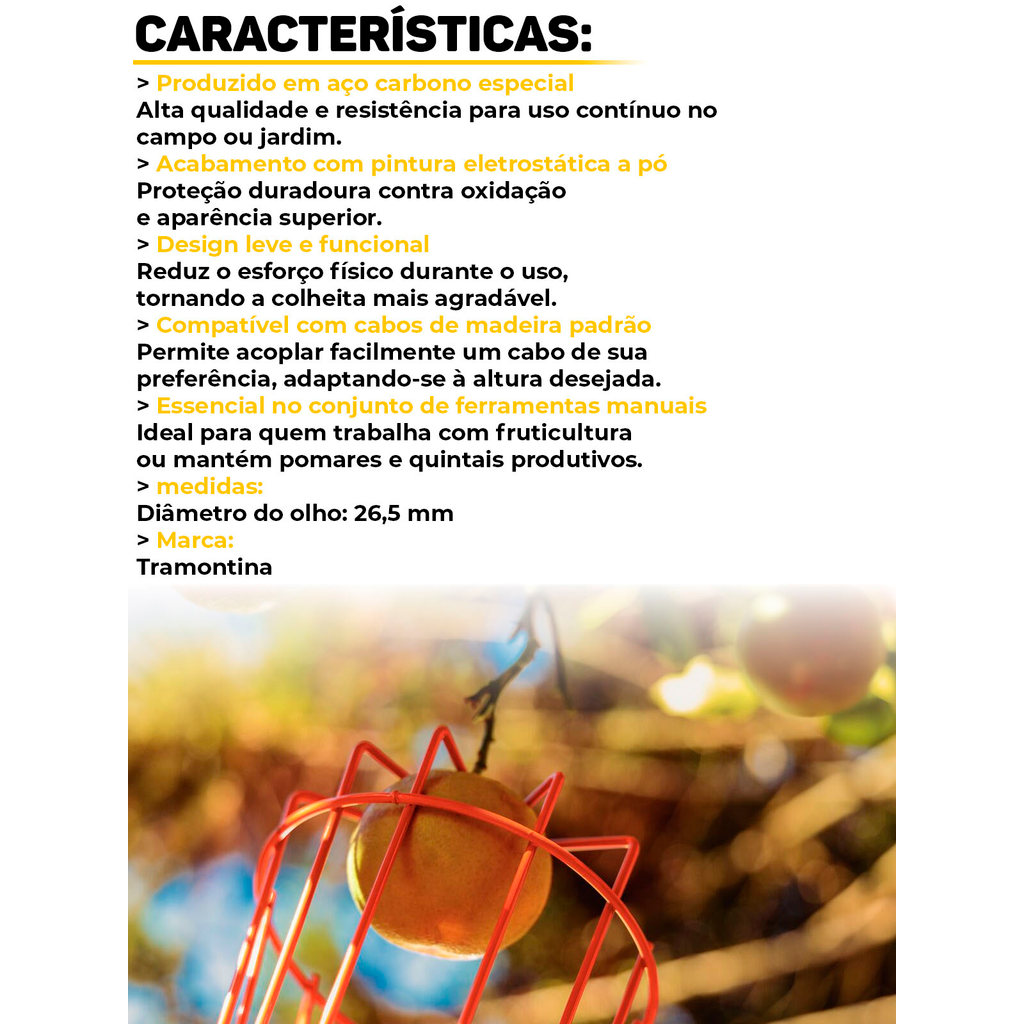 Colhedor De Frutas Pequeno Em Aço Sem Cabo 15Cm Tramontina Facilite a colheita de frutas no pomar ou no quintal com o Colhedor de Frutas Pequeno Tramontina em Aço Sem Cabo. Ideal para apanhar laranjas, maçãs, goiabas, bergamotas e diversas outras frutas com praticidade e segurança, ele é a ferramenta perfeita para quem busca eficiência e conforto no dia a dia. Produzido em aço carbono especial de alta qualidade, o colhedor garante resistência, durabilidade e excelente desempenho. Seu corpo leve reduz o esforço físico durante o uso, tornando a tarefa muito mais rápida, simples e prazerosa Com pintura eletrostática a pó, o colhedor recebe uma camada protetora que evita oxidação e proporciona acabamento visual superior, além de ser fabricado com tinta livre de metais pesados, reduzindo o impacto ambiental. Compacto e versátil, é a escolha ideal tanto para uso doméstico quanto profissional na colheita de frutas frescas diretamente do pé. Características: > Produzido em aço carbono especial de alta qualidade, com longa vida útil; > Leve e ergonômico, reduzindo o esforço físico durante o uso; > Pintura eletrostática a pó, com proteção contra oxidação e excelente acabamento; > Ideal para colher laranjas, maçãs, goiabas, bergamotas e outras frutas diretamente do pé. Especificações: > Modelo: Colhedor de Frutas Pequeno Sem Cabo; > Material: Aço carbono especial; > Acabamento: Pintura eletrostática a pó; > Cabo: Não incluso; > Aplicação: Colheita de frutas em pomares e quintais. - Marca: Tramontina - Garantia: 12 meses contra defeitos de fabricação Vantagens de comprar na Brester: - Produto a pronta entrega. - Produto novo, com garantia de fábrica. - Nota fiscal para Pessoa Física e Pessoa Jurídica.