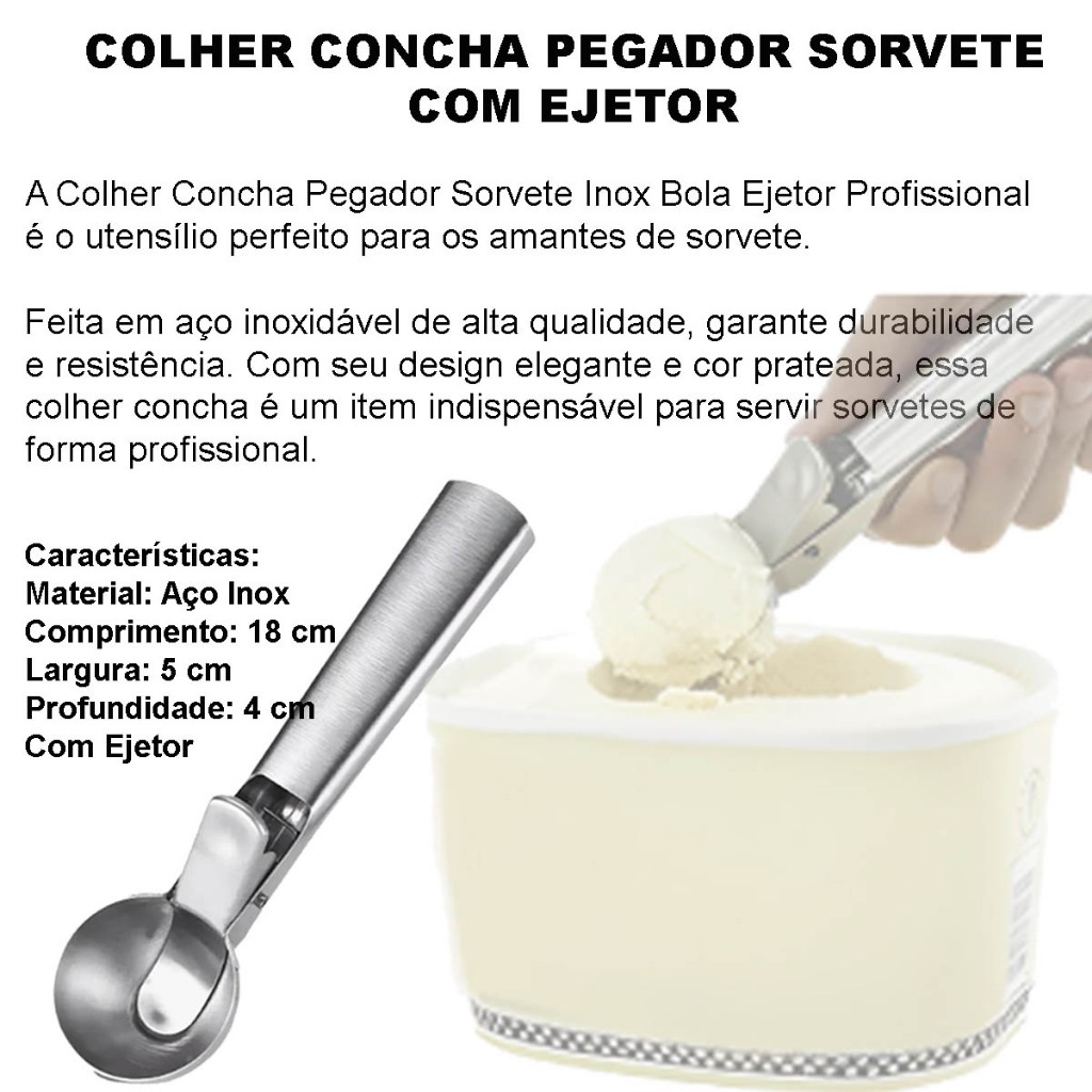 Colher Concha Pegador Sorvete Ejetor Bola Inox Profissional Sobremesa Açai Boleadora Sorveteria