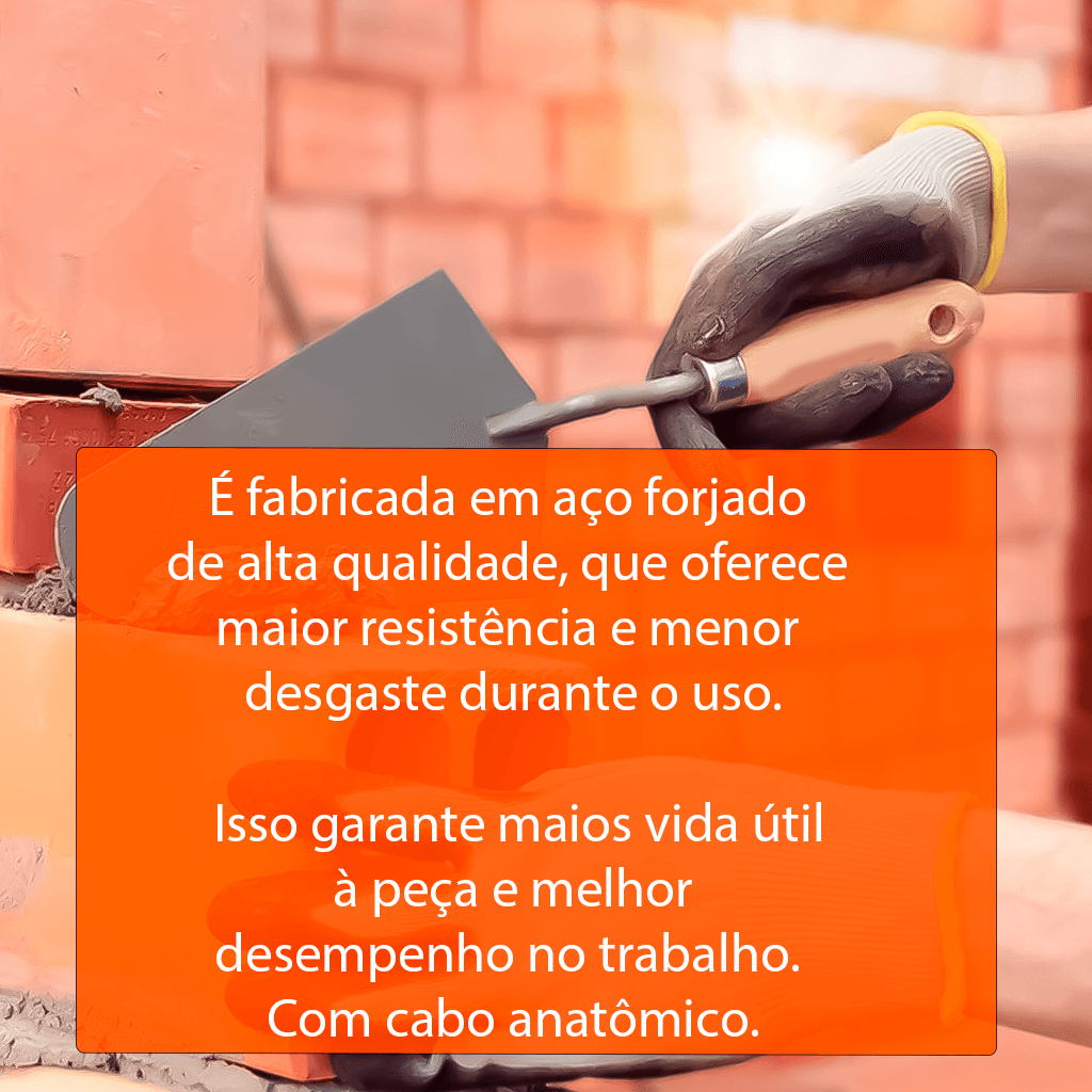 COMERCIAL VIPASA DISTRIBUIDORA. Colher Para Pedreiro Canto Redondo - Reto Profissional Vários Tamanhos Modelos Obra Construção Massa Colher Para Pedreiro Canto Redondo E Reto Profissional Vários Tamanhos E Modelos Obra Construção Massa Colher De Pedreiro Canto Redondo Ou Reto Profissional Vários Tamanhos Modelos Obra Construção Parede ATENÇÃO : ESCOLHER O MODELO E O TAMANHO DESEJADO NAS VARIAÇÕES. Descrição Descrição do Produto: CANTO RETO 8 - Polegadas 9 - Polegadas 10 - Polegadas CANTO REDONDO 7 - Polegadas 8 - Polegadas 9 - Polegadas 10 - Polegadas Material: Aço e madeira Cabo: madeira envernizada Para misturas de argamassas, assento de blocos, chapisco e rebocos. Colher de Pedreiro 8 Polegadas Reta - Ideal para construções. - Feita em aço resistente. - Cabo de madeira resistente e anatômico. Uma colher de pedreiro com cabo de madeira e lâmina de aço forjado é uma ferramenta comum usada na construção civil para espalhar e aplicar argamassa, cimento, gesso e outros materiais de construção. Aqui está uma descrição detalhada: Lâmina de Aço Forjado: A parte principal da colher de pedreiro é a sua lâmina, feita de aço forjado. O aço forjado é conhecido por sua durabilidade e resistência, tornando-o ideal para uso em ambientes de trabalho árduos da construção civil. A lâmina é geralmente retangular ou trapezoidal, com uma borda afiada para ajudar a espalhar os materiais de construção de forma eficiente. Cabo de Madeira: O cabo é feito de madeira robusta, como freixo, carvalho ou faia. A madeira é escolhida por sua resistência e durabilidade, além de proporcionar uma pegada confortável para o usuário. O cabo é frequentemente moldado ergonomicamente para se encaixar bem na mão e reduzir a fadiga durante o uso prolongado. Construção sólida: Tanto o cabo de madeira quanto a lâmina de aço são fixados de forma segura para garantir que a ferramenta seja resistente e durável. Geralmente, o cabo é inserido na lâmina e fixado com pinos de metal ou rebites para evitar que se solte durante o uso. Tamanho e Peso: As colheres de pedreiro vêm em uma variedade de tamanhos, desde modelos pequenos para trabalhos delicados até modelos maiores para tarefas mais pesadas. O peso também pode variar dependendo do tamanho e do material de construção, mas geralmente são projetados para serem manejados confortavelmente pelo usuário. Uso Versátil: Esta ferramenta é utilizada em uma variedade de tarefas na construção civil, incluindo a aplicação de argamassa em tijolos, blocos ou pedras, o nivelamento de superfícies e o preenchimento de espaços entre materiais de construção. Sua versatilidade e robustez a tornam indispensável para pedreiros, empreiteiros e trabalhadores da construção em geral. COMERCIAL VIPASA DISTRIBUIDORA.