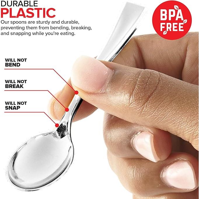 Colheres de sobremesa descartáveis de plástico prateadas de 9,8 cm, 50/100 unidades de colheres resistentes