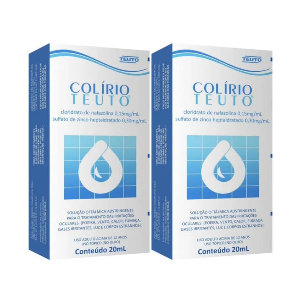 Kits Colírio Teuto 20ml Colírio Teuto é um solução oftálmica adstringente para o tratamento das irritações oculares (poeira, vento, calor, fumaça, gases irritantes, luz e corpos estranhos).
