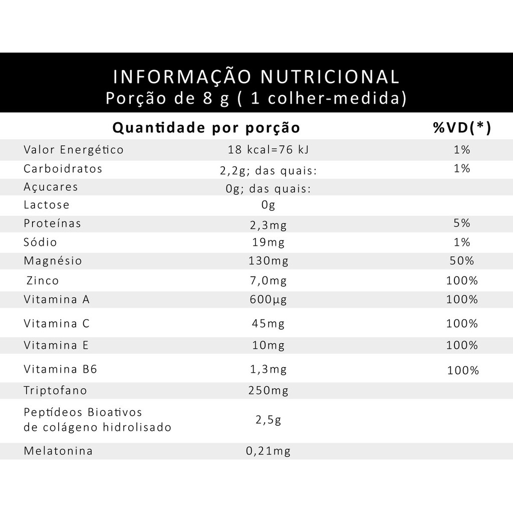 O Collagen & Melatonin combina os benefícios do colágeno Verisol®, que auxilia na manutenção da firmeza da pele, com melatonina, um hormônio essencial. Sua fórmula exclusiva também inclui vitaminas (C, A e E), triptofano, magnésio e zinco, que complementam a rotina noturna com benefícios adicionais. Com sabor relaxante de maracujá e capim-limão, é uma opção prática e deliciosa para consumir antes de dormir. Composição Peptídeos bioativos de colágeno hidrolisado, polpa de maracujá, L-triptofano, magnésio (sulfato de magnésio monohidratado), vitamina C (ascorbato de sódio), vitamina E (DL-alfa acetato de tocoferol), zinco (sulfato de zinco monohidratado), vitamina B6 (cloridrato de piridoxina), vitamina A (palmitato de retinol), melatonina, espessante polidextrose, aromas naturais de maracujá e capim-limão, acidulante ácido cítrico, antiumectante dióxido de silício, corante natural urucum e edulcorante estévia. Sugestão de Uso Dissolva 1 porção (8g) em 200ml de água ou bebida de sua preferência. Pode ser consumido gelado ou quente (não ferver). Para melhores resultados, consuma 30 a 60 minutos antes de dormir.