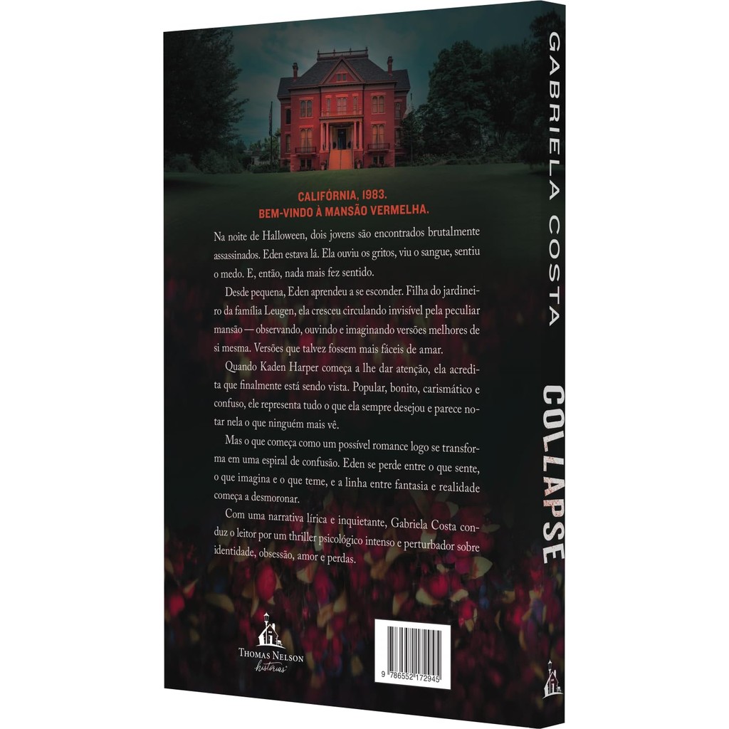 CALIFÓRNIA, 1983.BEM-VINDO À MANSÃO VERMELHA. Na noite de Halloween, dois jovens são encontrados brutalmente assassinados. Eden estava lá. Ela ouviu os gritos, viu o sangue, sentiu o medo. E, então, nada mais fez sentido. Desde pequena, Eden aprendeu a se esconder. Filha do jardineiro da família Leugen, ela cresceu circulando invisível pela peculiar mansão ― observando, ouvindo e imaginando versões melhores de si mesma. Versões que talvez fossem mais fáceis de amar. Quando Kaden Harper começa a lhe dar atenção, ela acredita que finalmente está sendo vista. Popular, bonito, carismático e confuso, ele representa tudo o que ela sempre desejou e parece notar nela o que ninguém mais vê. Mas o que começa como um possível romance logo se transforma em uma espiral de confusão. Eden se perde entre o que sente, o que imagina e o que teme, e a linha entre fantasia e realidade começa a desmoronar. Com uma narrativa lírica e inquietante, Gabriela Costa conduz o leitor por um thriller psicológico intenso e perturbador sobre identidade, obsessão, amor e perdas. 23x16 cm 288 Páginas