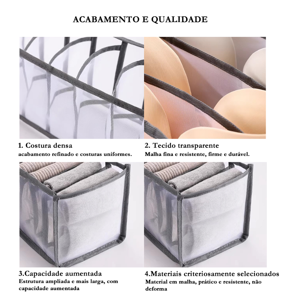 Nossa colmeia organizadora é a solução definitiva para manter sua roupa íntima arrumada, acessível e com máximo aproveitamento de espaço. Feita com material ecológico de alta qualidade, ela combina praticidade, durabilidade e responsabilidade ambiental. ✨ Características que fazem a diferença 1. Economiza Espaço: Aproveite cada centímetro da sua gaveta Projetada com divisórias modulares multi tamanhos, essa colmeia se adapta perfeitamente a gavetas de diferentes dimensões. Ela elimina o caos e agrupa suas peças de forma organizada — meias, calcinhas, cuecas e até acessórios pequenos têm seu lugar fixo. Diga adeus ao espaço desperdiçado: com essa organizadora, sua gaveta comporta 30% mais peças sem ficar bagunçada! 2. Material Ecológico: Prático e sustentável Feita com tecido não tecido reciclado e biodegradável, nossa colmeia é resistente, leve e não causa danos ao meio ambiente. Diferente dos plásticos convencionais, ela não libera substâncias tóxicas e é durável o suficiente para uso diário. Além disso, o material é respirável, evitando o acúmulo de umidade e odores em suas peças. 3. Multi Tamanhos: Versatilidade para todas as necessidades A colmeia vem em um modelo com compartimentos de tamanhos variados — desde pequenos (para meias e acessórios) até médios (para calcinhas e cuecas). Ela se encaixa em gavetas de closet, cômodas e armários, ideal para residências, apartamentos ou até viagens. E o melhor: não precisa de montagem — basta colocar na gaveta e começar a organizar! 4. Fácil de Limpar e Manter O tecido resistente permite limpeza rápida e prática: basta passar um pano úmido ou lavar à mão com sabão neutro. Seca rapidamente e não perde sua forma, garantindo uso prolongado sem desgaste. 🎯 Por que escolher nossa Colmeia Organizadora? ✅ Economiza espaço: Máximo aproveitamento da gaveta, sem bagunça. ✅ Material ecológico: Sustentável e seguro para suas peças. ✅ Multi tamanhos: Versátil para roupa íntima e acessórios pequenos. ✅ Instalação instantânea: Sem montagem, sem complicações. ✅ Fácil de limpar: Manter arrumado nunca foi tão simples. 📦 O que você recebe? 1 Peça de Colmeia Organizadora Multi Tamanhos Guia de dicas para organização de gavetas 💡 Dicas de Uso Separe suas peças por tipo ou cor para facilitar a busca. Use em gavetas de closet, cômodas ou até em bolsas de viagem para manter acessórios arrumados. Lave periodicamente para manter a higiene e a durabilidade do produto. Deixe suas gavetas arrumadas e funcionais com a Colmeia Organizadora Economiza Espaço — Material Ecológico! A solução prática para quem ama ordem sem abrir mão da sustentabilidade.