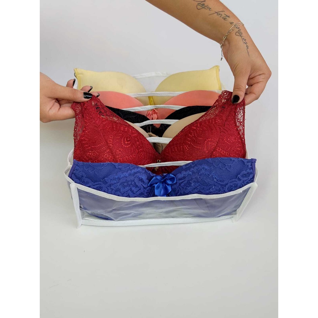 ENVIO IMEDIATO PARA TODO O PAÍS. PRODUTO DE QUALIDADE! Organizador de gavetas tipo colmeia para sutiã com bojo. A colmeia organizadora vai facilitar seu dia a dia na organização dos seus sutiãs do tamanho P ao GG. Material resistente, transparente com acabamento em viés, facil de visualizar e manter a organização na gaveta Com essa colmeia do tipo transparente tenha mais praticidade e organização no seu dia a dia FICHA TÉCNICA Altura: 10cm Largura:30cm Comprimento:30cm Divisórias transparentes Viés em TNT branco Fabricado no Brasil PERGUNTAS FREQUENTES: 1. Quantos sutiãs cabem nessa colmeia? R- Nesse tipo de colmeia organizadora pode ser colocado até 6 sutiãs dos tamanhos P ao GG. 2. Quanto tempos após o pedido recebo minhas colmeias organizadoras? R- Após a confirmação do pagamento o pedido é enviado em no máximo 24hrs 3. Quantas divisórias possui a colmeia organizadora? R- 6 divisórias 4. Posso comprar a partir de quantas unidades? R- Temos em nossa loja quantidades a partir de 1 colmeia organizadora até kits com 20 unidades ou mais. Boas Compras !