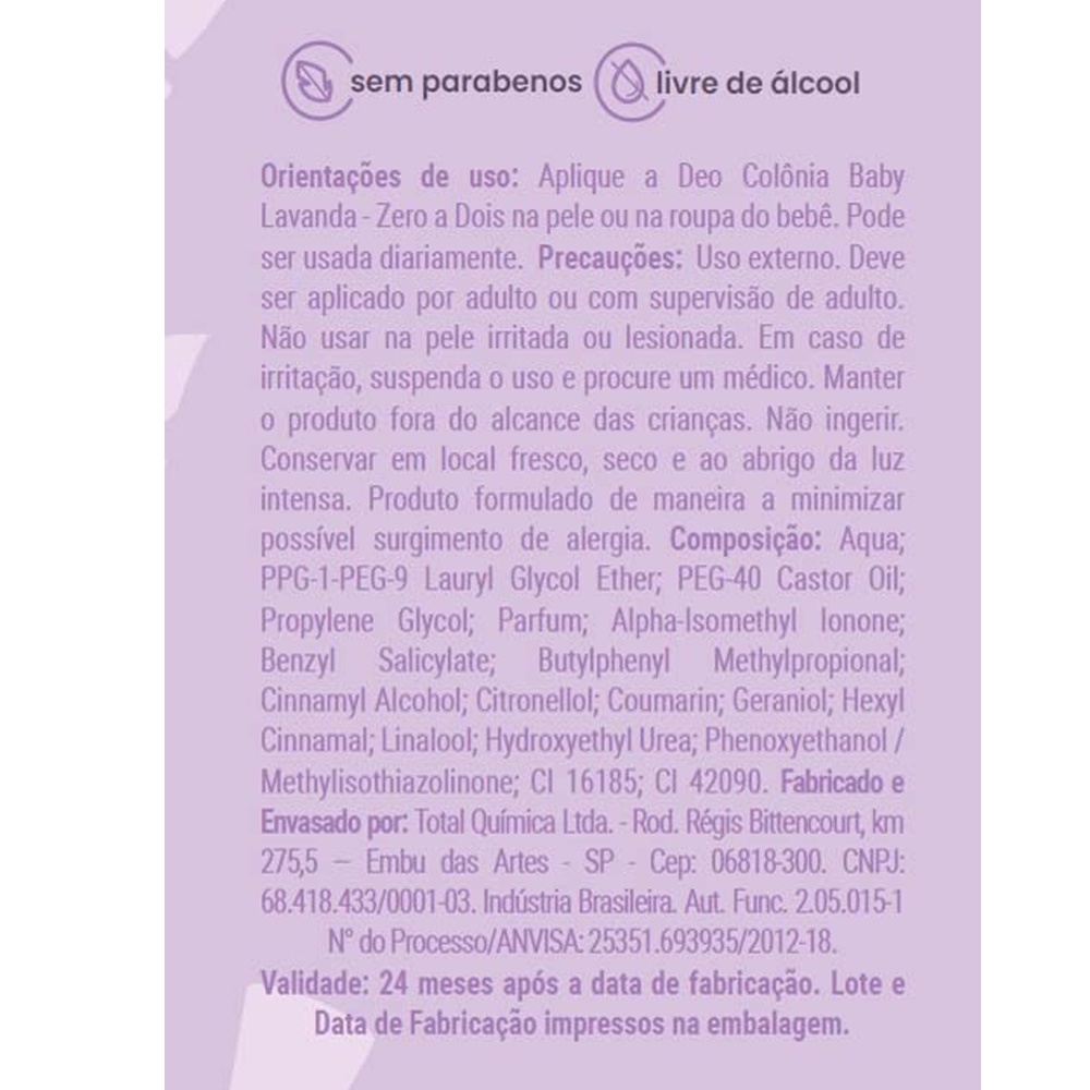 Deo Colônia para Bebês - Cheirinho suave de neném Perfume de bebê 0a2 ml Dermatologicamente testada Livre de corantes, parabenos, álcool etílico e ingredientes de origem animal Inspirada na natureza Perfuma suavemente a pele mais delicada, proporcionando uma gostosa sensação de frescor e bem estar Testado e aprovado por Dermatologistas e Pediatras, além disso é hipoalergênico