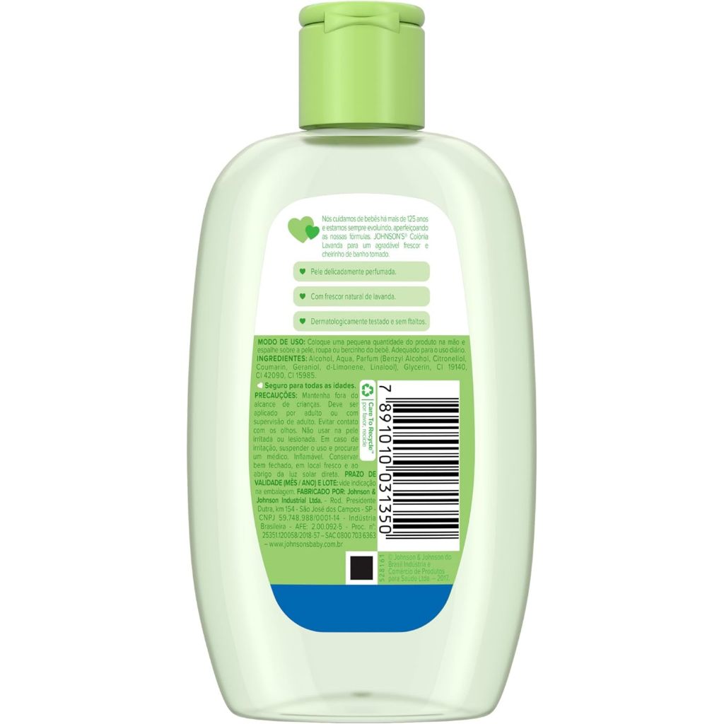 Principais Características: • Colônia infantil com fragrância suave de lavanda, especialmente desenvolvida para a pele delicada do bebê. • Fórmula hipoalergênica e dermatologicamente testada, garantindo segurança no uso diário. • Frasco com 200 ml, prático para aplicar e refrescar a pele do bebê ao longo do dia. Benefícios: • Proporciona sensação de frescor e bem-estar para a criança. • Aroma delicado de lavanda que ajuda a criar momentos de relaxamento. • Fórmula suave, adequada para a pele sensível do bebê. Diferenciais do Produto: • Produto de uma marca reconhecida mundialmente pelo cuidado infantil. • Fragrância duradoura e suave, perfeita para uso diário. • Hipoalergênico e testado por dermatologistas, minimizando risco de irritações. Especificações Técnicas: • Peso: 200 ml Instruções de Uso: • Borrifar delicadamente sobre a pele ou roupas do bebê, evitando contato com os olhos. • Pode ser usado várias vezes ao dia conforme necessidade. Avisos e Precauções: • Manter fora do alcance de crianças sem supervisão. • Evitar contato com os olhos e mucosas. • Em caso de irritação, suspender o uso e consultar um médico. O que está incluso? • 1 colônia refrescante infantil Johnson's Baby Lavanda 200 ml ---- DÚVIDAS FREQUENTES ---- Os produtos são originais? Sim. Todos os nossos produtos são originais. Emitem nota fiscal? Sim. Emitimos nota fiscal para todos os pedidos.