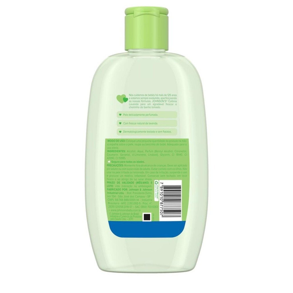 O que é e para que serve? A Colônia Refrescante Lavanda Para Bebês JOHNSON'S® Baby, 400mL ajuda a manter seu bebê perfumado e fresquinho entre um banho e outro, com um cheirinho de banho tomado, garantindo uma pele delicadamente perfumada com frescor natural de lavanda. Fórmula com suavidade comprovada, segura para todas as idades. Benefícios e diferenciais Livre de parabenos e ftalatos Frescor natural de lavanda Cheirinho de banho tomado Pele delicadamente perfumada Testada por dermatologistas Como usar Coloque uma pequena quantidade do produto na mão e espalhe sobre a pele, roupa ou bercinho do bebê. Adequado para uso diário. Indicações de uso: Seguro para todas as idades Composição Alcohol, Aqua, Parfum (Benzyl Alcohol, Citronellol, Coumarin, Geraniol, d-Limonene, Linalool), Glycerin, CI 19140, CI 42090, CI 15985. Precauções Mantenha fora do alcance de crianças. Deve ser aplicado por adulto ou com supervisão de adulto. Evitar contato com os olhos. Não usar na pele irritada ou lesionada. Inflamável. Conservar bem fechado, em local fresco e ao abrigo de luz solar direta.