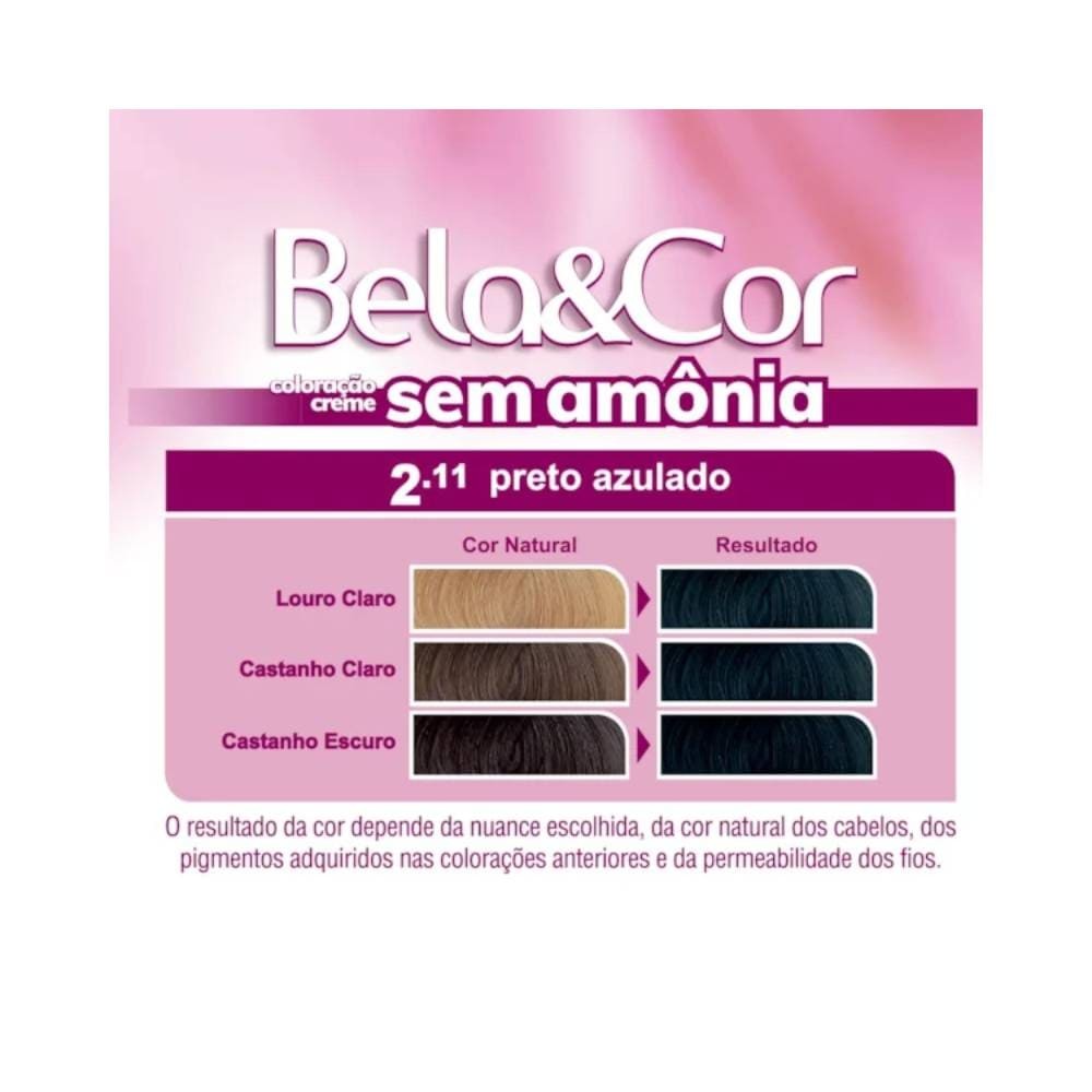 | Coloração Bela&Cor Sem Amônia 2.11 Preto Azulado este produto | R$ 18,99 | — | 5.0/5 | — |
