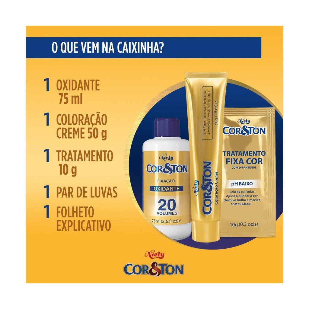 A coloração Cor&Ton você realiza seu desejo de clarear ou escurecer os cabelos, realçar sua cor natural, revelar reflexos ou cobrir os cabelos brancos. Com sachê de tratamento Fixacor com pH baixo, que finaliza o processo de colorir, selando as cutículas e deixando as cores mais firmes e duradouras, além de melhorar a textura e a maciez dos fios. A tintura de cabelo Niely Cor&Ton garante alta durabilidade com cor firme e luminosa mesmo após um mês, 100% de cobertura dos fios brancos e fórmula potente garantindo uma cor uniforme da raiz às pontas. E o melhor? Você mesma faz! Um cabelo de diva em apenas 40 minutos. São 41 cores e uma perfeita para vocês! A tinta de cabelo que pinta, hidrata e dura um tempão. Oferece vários benefícios aos cabelos: • Proporciona aos cabelos cores vivas, luminosas e duradouras • Total cobertura dos fios brancos • Hidratação, sedosidade e brilho • Com queratina, gérmen de trigo, silicone e filtro UV que garantem cabelos fortes, nutridos e com máxima proteção • Com textura cremosa, facilita a distribuição nos fios, fazendo com que os pigmentos sejam facilmente absorvidos.