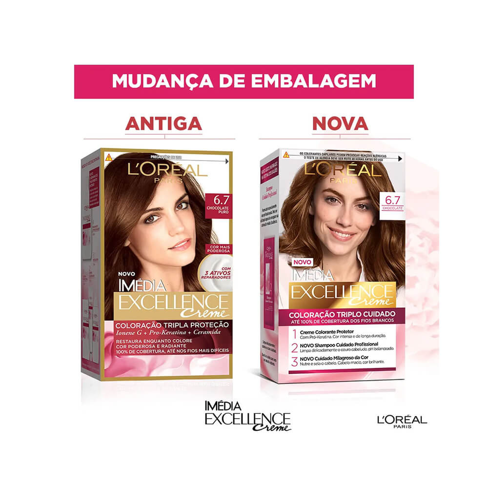 COLORAÇÃO IMÉDIA EXCELLENCE 6.7 CHOCOLATE ========================================= A Coloração Imédia Excellence 6.7 Chocolate da L'Oréal Paris oferece um resultado profissional diretamente em sua casa. Com uma fórmula enriquecida com Triplo Cuidado, esta coloração não apenas colore, mas também protege e nutre os seus cabelos. Sua fórmula cuida dos fios antes, durante e após a coloração, garantindo proteção total e intensa. A coloração protege e nutre os fios, garantindo beleza e saúde com um toque profissional. FÓRMULA COM TRIPLA PROTEÇÃO Sua fórmula cuida dos fios antes, durante e após a coloração, garantindo proteção total e intensa. CUIDADO E NUTRIÇÃO COMPLETA A coloração protege e nutre os fios, garantindo beleza e saúde com um toque profissional. MODO DE USO =========== Para obter os melhores resultados, siga as instruções de uso cuidadosa e corretamente para que a coloração fique uniforme e duradoura. Misture bem o creme colorante e o revelador em um recipiente não metálico até obter uma consistência homogênea. Aplique a mistura uniformemente nos cabelos secos e não lavados, iniciando pela raiz até as pontas. Deixe agir por 30 minutos para garantir a fixação da cor e a cobertura dos fios brancos. Após o tempo de pausa, enxágue abundantemente e aplique o condicionador para selagem da cor e garantir brilho. PREPARAÇÃO Misture bem o creme colorante e o revelador em um recipiente não metálico até obter uma consistência homogênea. APLICAÇÃO Aplique a mistura uniformemente nos cabelos secos e não lavados, iniciando pela raiz até as pontas. TEMPO DE AÇÃO Deixe agir por 30 minutos para garantir a fixação da cor e a cobertura dos fios brancos. ENXÁGUE E FINALIZAÇÃO Após o tempo de pausa, enxágue abundantemente e aplique o condicionador para selagem da cor e garantir brilho. CARACTERÍSTICAS E BENEFÍCIOS DA COLORAÇÃO IMÉDIA EXCELLENCE 6.7 CHOCOLATE ========================================================================= A coloração oferece uma cobertura de até 100% dos fios brancos, garantindo uma cor uniforme e vibrante. Além disso, a inclusão de Pro-Keratina promove a saúde e a resistência dos fios ao longo do processo de coloração. Proporciona até 100% de cobertura dos fios brancos, assegurando uma cor uniforme e profunda. Inclui um Shampoo Cuidado Profissional que limpa suavemente os fios após o processo de coloração. O condicionador incluso sela a cor nos fios, conferindo maciez extrema e brilho intenso. Compatível com todos os tipos de cabelo, proporciona resultados consistentes e satisfatórios para qualquer pessoa. COBERTURA DE ATÉ 100% DOS FIOS BRANCOS Proporciona até 100% de cobertura dos fios brancos, assegurando uma cor uniforme e profunda. TRATO COMPLETO AOS FIOS Inclui um Shampoo Cuidado Profissional que limpa suavemente os fios após o processo de coloração. SELAGEM DA COR O condicionador incluso sela a cor nos fios, conferindo maciez extrema e brilho intenso. COMPATIBILIDADE UNIVERSAL Compatível com todos os tipos de cabelo, proporciona resultados consistentes e satisfatórios para qualquer pessoa. ESPECIFICAÇÕES TÉCNICAS ======================= A embalagem do produto contém componentes cuidadosamente selecionados para garantir eficácia máxima na coloração dos cabelos. Inclui itens essenciais para aplicação precisa e segura. Tipo de Coloração: Coloração Permanente Fórmula Avançada: Com Pro-Keratina para revitalização capilar Cobertura Completa: Até 100% dos fios brancos Cuidados Adicionais: Shampoo profissional incluso para manutenção pós-coloração SOBRE A MARCA L'ORÉAL PARIS =========================== A L'Oréal Paris é uma marca reconhecida mundialmente, sinônimo de inovação e qualidade em produtos de beleza. Com mais de um século de história, a marca se compromete a oferecer produtos que atendam às necessidades de beleza e cuidados pessoais dos consumidores. A L'Oréal investe continuamente em pesquisa e desenvolvimento para oferecer produtos de qualidade superior. A marca acredita que a beleza é universal e se dedica a proporcionar produtos que atendam a todos os tipos de pele e cabelo. Comprometida com práticas sustentáveis, a L'Oréal busca reduzir o impacto ambiental de seus produtos. INOVAÇÃO CONSTANTE A L'Oréal investe continuamente em pesquisa e desenvolvimento para oferecer produtos de qualidade superior. COMPROMISSO COM A BELEZA A marca acredita que a beleza é universal e se dedica a proporcionar produtos que atendam a todos os tipos de pele e cabelo. SUSTENTABILIDADE Comprometida com práticas sustentáveis, a L'Oréal busca reduzir o impacto ambiental de seus produtos.