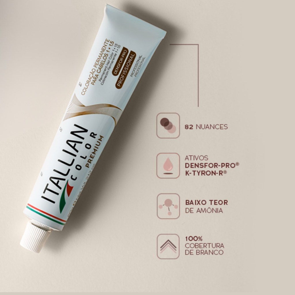 Coloração Itallian Color Professional proporciona 100% de cobertura dos brancos com brilho e durabilidade enquanto protege o cabelo durante o uso com emoliência e umectação. Os pigmentos da Coloração Itallian Color Professional são resistentes à luz e às lavagens dos fios, o que garante proteção contra o desbotamento e intensidade até o próximo retoque da raiz. Ativos: Silk PPO: Combinação de ingredientes que inclui a Proteína da Seda, extraída das fibras puras da seda sob condições extremamente controladas. Essas fibras naturais são constituídas por estruturas denominadas fibroínas, que são revestidas de sericina. As fibroínas são ricas em aminoácidos (glicina, alanina, tirosina e serina), que fazem parte da composição da fibra capilar. - Brilho acentuado - Proporciona umectação e emoliência aos fios Modo de uso: Para cabelo com alto percentual de brancos: Misture 60g de Coloração Itallian Color com 90ml de Itallian Oxi 20 ou 30 Volumes, de acordo com o diagnóstico profissional. Aplique e deixe em pausa por 40 minutos. Para cabelo natural: Misture 60g de Coloração Itallian Color com 90ml de Itallian Oxi 20, 30 ou 40 Volumes, de acordo com o diagnóstico profissional. Aplique sobre os cabelos, deixando em pausa por 35 minutos. Retoque de raiz: Misture 60g de Coloração Itallian Color com 90ml de Itallian Oxi 20, 30 ou 40 Volumes, de acordo com o diagnóstico profissional. Aplique na raiz e deixe agir por 25 minutos. Após esse tempo, aplique o restante da mistura no comprimento e pontas e deixe em pausa por mais 10 minutos. Importante: O tempo total de aplicação não deve ser superior ao indicado. Utilize sempre Itallian Oxi de 20, 30 ou 40 Volumes e siga a proporção recomendada de 1 + 1,5. Escolha a técnica de aplicação e a volumagem do oxidante de acordo com o resultado desejado e com as condições do fio. Nesse ponto, o diagnóstico profissional é essencial. Precaução: Pode causar reação alérgica. Cuidado. Contém substâncias passíveis de causar irritação na pele de determinadas pessoas. Antes de usar, faça a prova de toque com o teste de sensibilidade. Enxágue bem o cabelo após a aplicação. Não use nos cílios, sobrancelhas e buço. A aplicação direta em sobrancelhas ou cílios pode causar irritação nos olhos ou cegueira. Não aplique se o couro cabeludo estiver irritado ou lesionado. Em caso de contato com os olhos, lave imediatamente com água em abundância e, se necessário, procure um médico. Use luvas adequadas. Contém fenilenodiaminas, diaminobenzenos e resorcinol. Contém amônia. Não se recomenda o uso deste produto em gestantes e crianças. Mantenha fora do alcance de crianças. Só para uso profissional. Prova de Toque: Em uma superfície atrás da orelha, faça a aplicação da mistura com a coloração permanente + Itallian Oxi na proporção recomendada nas instruções de uso. Deixe por um período igual ao tempo de pausa e lave o local. Se não houver reação visível durante 24 horas, proceda à aplicação do produto. CORES: NATURAIS (1 + 1,5) 01. PRETO (1.0) 03. CASTANHO ESCURO (3.0) 04. CASTANHO (4.0) 05. CASTANHO CLARO (5.0) 06. LOURO ESCURO (6.0) 07. LOURO (7.0) 08. LOURO CLARO (8.0) 09. LOURO CLARÍSSIMO (9.0) 10. LOURO PLATINA (10.0) NATURAL PLUS (1 + 1,5) (REFLEXO MAIS INTENSO) 4.00 CASTANHO PLUS (4.00) 5.00 CASTANHO CLARO PLUS (5.00) 6.00 LOURO ESCURO PLUS (6.00) 7.00 LOURO PLUS (7.00) 8.00 LOURO CLARO PLUS (8.00) CINZAS (1 + 1,5) NB. PRETO AZULADO (2.1) 14. CASTANHO CINZA (4.1) 15. CASTANHO CLARO CINZA (5.1) 16. LOURO ESCURO CINZA (6.1) 17. LOURO CINZA (7.1) 18. LOURO CLARO CINZA ( 8.1) 19. LOURO CLARÍSSIMO CINZA (9.1) 811. LOURO CLARO CINZA INTENSO (8.11) 10.01. LOURO PLATINA NATURAL CINZA (10.01) (UC1) DOURADOS (1 + 1,5) 25. CASTANHO CLARO DOURADO (5.3) 26. LOURO ESCURO DOURADO (6.3) 27. LOURO DOURADO (7.3) 28. LOURO CLARO DOURADO (8.3) 29. LOURO CLARÍSSIMO DOURADO (9.3) BEGE (1 + 1,5) 613. LOURO ESCURO BEGE ACINZENTADO (6.13) 631. LOURO ESCURO DOURADO CINZA (6.31) 17A. LOURO CINZA DOURADO (7.13) 813. LOURO CLARO BEGE ACINZENTADO (8.13) 913. LOURO CLARÍSSIMO CINZA DOURADO (9.13) (540) 731. LOURO BEGE DOURADO (7.31) 831. LOURO CLARO DOURADO CINZA (8.31) 931. LOURO CLARÍSSIMO DOURADO CINZA (9.31) MARRON FRIO (1 + 1,5) 517. CASTANHO CLARO CINZA MARROM (5.17) 617. LOURO ESCURO CINZA MARROM (6.17) 717. LOURO CINZA MARROM (7.17) 817. LOURO CLARO CINZA MARROM (8.17) 917. LOURO CLARÍSSIMO CINZA MARROM (9.17) MARRON QUENTE (1 + 1,5) 541. CASTANHO CLARO COBRE CINZA (5.41) 641. LOURO ESCURO COBRE CINZA (6.41) 57. CASTANHO CLARO MARROM (5.7) 67. LOURO ESCURO MARROM (6.7) 77. LOURO MARROM (7.7) 677. LOURO ESCURO MARROM INTENSO (6.77) PÉROLA (1 + 1,5) 789. LOURO PÉROLA (7.89) 889. LOURO CLARO PÉROLA (8.89) 989. LOURO CLARÍSSIMO PÉROLA (9.89) VERMELHOS (1 + 1,5) 660. LOURO ESCURO VERMELHO NATURAL (6.60) 562. CASTANHO CLARO VERMELHO VIOLETA (5.62) 662. LOURO ESCURO VERMELHO VIOLETA (6.62) 766. LOURO VERMELHO INTENSO (7.66) 666. LOURO ESCURO VERMELHO INTENSO (6.66) COBRE (1 + 1,5) 534.