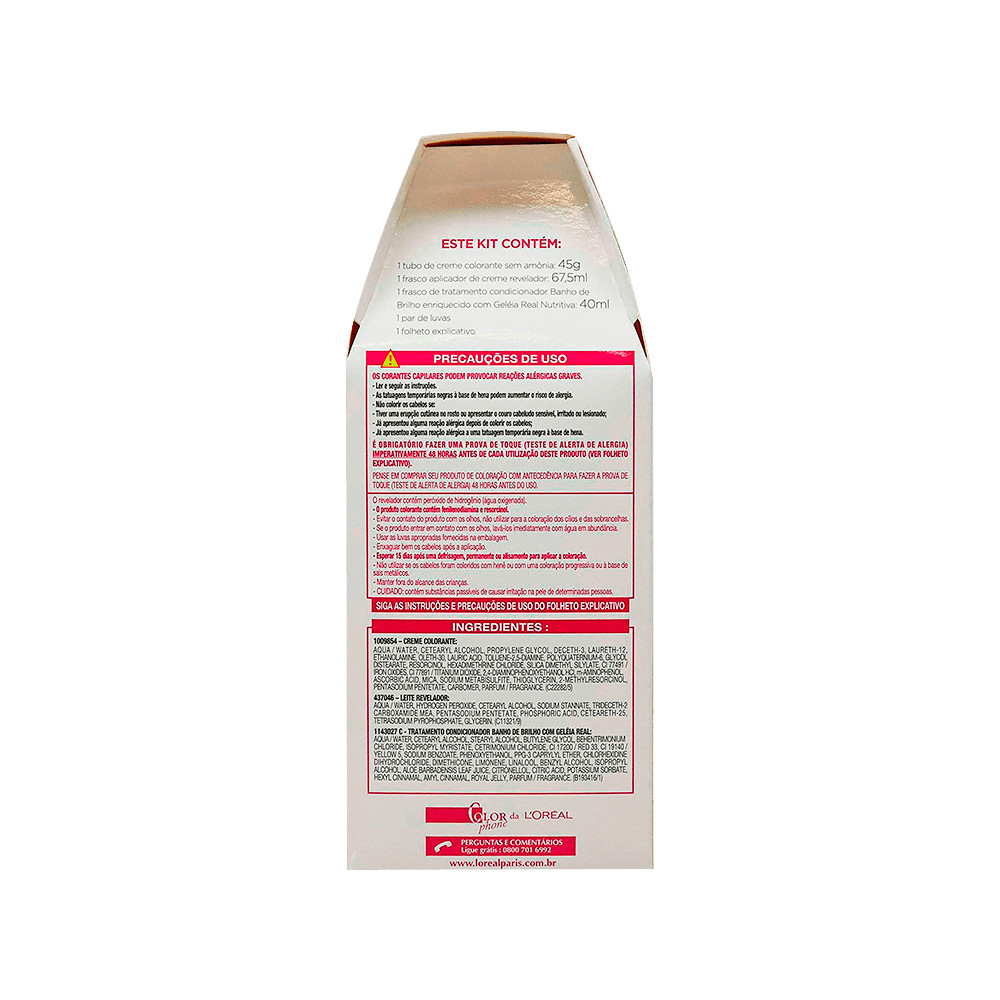 COLORAÇÃO LOURO NATURAL CASTING CREME GLOSS 700 =============================================== O Colorac¸ão Louro Natural Casting Creme Gloss 700 da L'Oréal Paris é uma coloração semi-permanente que oferece uma cor vibrante e um brilho deslumbrante. Sua fórmula sem amônia respeita a saúde dos cabelos, proporcionando uma aplicação delicada e eficiente. Oferece cobertura eficaz para os cabelos brancos, garantindo um resultado uniforme e natural. Este produto oferece até quatro vezes mais brilho comparado às colorações tradicionais, garantindo cabelos radiantes por até 28 lavagens. COBERTURA COMPLETA DE FIOS BRANCOS Oferece cobertura eficaz para os cabelos brancos, garantindo um resultado uniforme e natural. BRILHO INTENSO E DURADOURO Este produto oferece até quatro vezes mais brilho comparado às colorações tradicionais, garantindo cabelos radiantes por até 28 lavagens. MODO DE USO =========== Para utilizar o produto, aplique a coloração nos cabelos secos e não lavados. Após a aplicação, aguarde o tempo recomendado para obter a cor desejada. Divida o cabelo em seções e aplique o produto uniformemente em cada uma delas. Deixe a coloração agir por 20 a 30 minutos, conforme a intensidade de cor desejada. Enxágue o cabelo abundantemente até que a água esteja clara, removendo todo o excesso de produto. Aplique o condicionador pós-coloração para garantir cabelos macios e brilhantes. APLICAR A COLORAÇÃO Divida o cabelo em seções e aplique o produto uniformemente em cada uma delas. AGUARDAR O TEMPO DE AÇÃO Deixe a coloração agir por 20 a 30 minutos, conforme a intensidade de cor desejada. ENXAGUAR BEM Enxágue o cabelo abundantemente até que a água esteja clara, removendo todo o excesso de produto. FINALIZAR COM CONDICIONADOR Aplique o condicionador pós-coloração para garantir cabelos macios e brilhantes. CARACTERÍSTICAS E BENEFÍCIOS DA COLORAÇÃO LOURO NATURAL CASTING CREME GLOSS 700 =============================================================================== Este produto combina beleza e cuidado, oferecendo uma tonalidade iluminada sem comprometer a saúde capilar. A coloração Louro Natural 700 mantém seus cabelos nutridos enquanto realça a cor. A coloração é suave devido à ausência de amônia, respeitando a estrutura dos fios durante o processo. Os ingredientes condicionantes garantem hidratação profunda enquanto realçam a cor dos cabelos. Proporciona quatro vezes mais brilho comparado a colorações tradicionais, deixando os cabelos radiantes. Pode ser usado em cabelos quimicamente tratados, garantindo segurança e eficácia no resultado final. FÓRMULA SEM AMÔNIA A coloração é suave devido à ausência de amônia, respeitando a estrutura dos fios durante o processo. NUTRIÇÃO INTENSA Os ingredientes condicionantes garantem hidratação profunda enquanto realçam a cor dos cabelos. BRILHO INTENSO Proporciona quatro vezes mais brilho comparado a colorações tradicionais, deixando os cabelos radiantes. COMPATÍVEL COM TRATAMENTOS QUÍMICOS Pode ser usado em cabelos quimicamente tratados, garantindo segurança e eficácia no resultado final. ESPECIFICAÇÕES TÉCNICAS ======================= Este produto oferece tecnologia avançada que maximiza a durabilidade da cor, evitando desbotamento precoce. Desenvolvido para durar até 28 lavagens, prolonga o efeito da coloração mantendo o brilho intenso. Tipo de Coloração: Tintura em Creme Tecnologia: Sem amônia Durabilidade: Até 28 lavagens Cobertura: Eficaz para cabelos brancos Nutrientes: Enriquecido com Geleia Real SOBRE A MARCA L'ORÉAL PARIS =========================== A L'Oréal Paris é uma marca de prestígio mundialmente reconhecida por sua inovação e qualidade em produtos de beleza. Com um compromisso contínuo com a pesquisa e desenvolvimento, a marca oferece soluções eficazes para realçar a beleza de cada indivíduo. A L'Oréal está sempre à frente, trazendo as mais recentes tecnologias em beleza. Os produtos são testados rigorosamente para garantir a satisfação dos clientes. A marca prioriza fórmulas que respeitam a saúde dos fios e do couro cabeludo. INOVAÇÃO CONTÍNUA A L'Oréal está sempre à frente, trazendo as mais recentes tecnologias em beleza. QUALIDADE GARANTIDA Os produtos são testados rigorosamente para garantir a satisfação dos clientes. COMPROMISSO COM A SAÚDE CAPILAR A marca prioriza fórmulas que respeitam a saúde dos fios e do couro cabeludo.