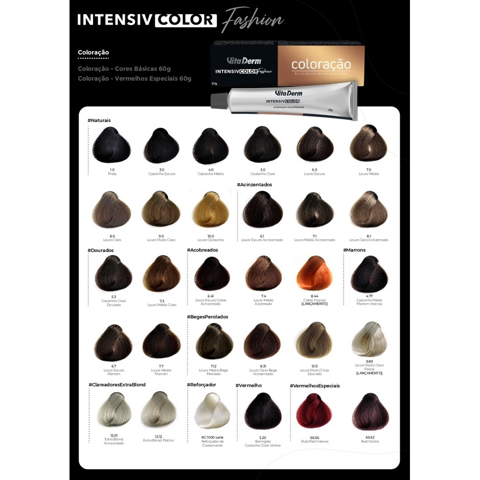 Vita Derm Intensiv Color Fashion PRO 6.0 LOURO ESCURO Coloração permanente em creme para todos os tipos de cabelo. Vita Derm Intensiv Color Fashion PRO assegura cobertura perfeita e cores vibrantes, além de garantir longa duração e tingimento uniforme. A Coloração Permanente Vita Derm Intensiv Color Fashion PRO conta com o exclusivo complexo Phytoshine®, tecnologia capaz de prolongar o brilho dos fios, cuidar da saúde capilar e promover aspecto natural. Com formulação altamente tecnológica e disponível em diversos tons incríveis, o produto também colore os fios brancos por completo, proporciona luminosidade intensa e confere toque extremamente macio. Conselho de Aplicação Antes de realizar a aplicação, leia atentamente todos os passos descritos na bula do produto. Observações: - Recomendamos que a aplicação seja feita somente com o auxílio de um profissional; - Gestantes e lactantes devem consultar seu médico antes de fazer o uso; - Não deve ser aplicado em menores de 15 anos; - Indicamos a realização de um teste de toque e de mecha antes do início do procedimento; - Em caso de irritação ou ferida pré-existente no couro cabeludo, consulte um médico antes da aplicação. Nossos Experts Ensinam Para que os seus cabelos permaneçam brilhantes e intactos mesmo após diversas lavagens, é importante tratá-los com produtos específicos para fios coloridos. Phytoshine®: complexo exclusivo, responsável por manter os cabelos brilhantes, saudáveis e com aparência natural por muito mais tempo. Fios perfeitamente sadios, uniformes e livres dos brancos por tempo prolongado.