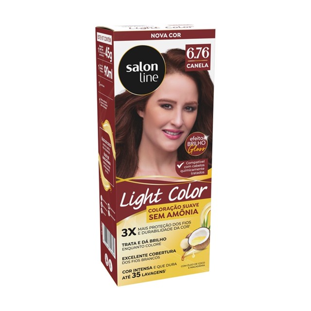 Light Color Coloração 6.76 Canela garante cor intensa, proteção aos fios e brilho extraordinário. Coloração suave sem amônia. <>INDICAÇÕES$& Para quais tipos de cabelo? Para todas as curvaturas. Qual a indicação? Para todos os tipos de cabelo. Pode usar a partir de quantos anos? A partir de 12 anos. <>ATIVOS$& Quais os principais ativos? Óleo de coco: nutre o cabelo pós-coloração, além de fortalecer os fios e proporciona brilho e maciez extrema. Óleo de macadâmia: hidrata e nutre intensamente os fios. <>MODO DE USO$& Qual a melhor forma de usar? Confira o passo a passo e escolha a opção de aplicação mais apropriada para os seus cabelos: Preparação da mistura 1. Desembarace e molhe os cabelos com água, sem lavá-los. 2. Enxugue-os cuidadosamente. Caso os cabelos possuam resíduos de gel, mousse, etc ou estejam oleosos, lave-os com shampoo Salon Line. 3. Coloque as luvas. 4. Com um pincel, misture bem em um recipiente não metálico o conteúdo da bisnaga de coloração Light Color de 45g com 90ml de Emulsão Ativadora Salon Line até obter uma consistência homogênea e cremosa. 5. Utilize a mistura imediatamente e não guarde sobras. Aplicação/tempo de ação em cabelos naturais Aplique a mistura uniformemente nos cabelos mecha por mecha, na raiz, comprimento e pontas. Para cabelos finos, louros, avermelhados, permanentados, alisados e relaxados, deixe a mistura agir por 15 minutos. Para cabelos normais, grisalhos e escuros, deixe a mistura agir por 20 minutos. Aplicação/tempo de ação em aplicações subsequentes Aplique na raiz dos cabelos por 15 minutos e no comprimento e pontas somente nos últimos 5 minutos, totalizando o tempo de ação de 20 minutos. Enxágue Após o tempo de ação, enxágue abundantemente até que a água corra límpida. Não é necessário usar shampoo. Aplique o Condicionador Salon Line e deixe agir por 3 minutos. Enxágue abundantemente. Dicas de uso Antes de iniciar a aplicação, passe um pouco de creme hidratante na testa (próximo aos cabelos), orelhas e nuca para facilitar a retirada da coloração e evitar que a pigmentação manche sua pele. Salon Line recomenda Antes da aplicação da Coloração Light Color, é importante realizar o teste de sensibilidade e o teste de mecha para detectar possíveis reações adversas e determinar o tempo de aplicação do produto e o resultado da cor. Por isso, não deixe de conferir a bula que acompanha a Coloração Light Color. <>CARACTERÍSTICAS$& É produto vegano? A Light Color Coloração 6.76 Canela não é vegana. É liberado? A Light Color Coloração 6.76 Canela não é liberada.