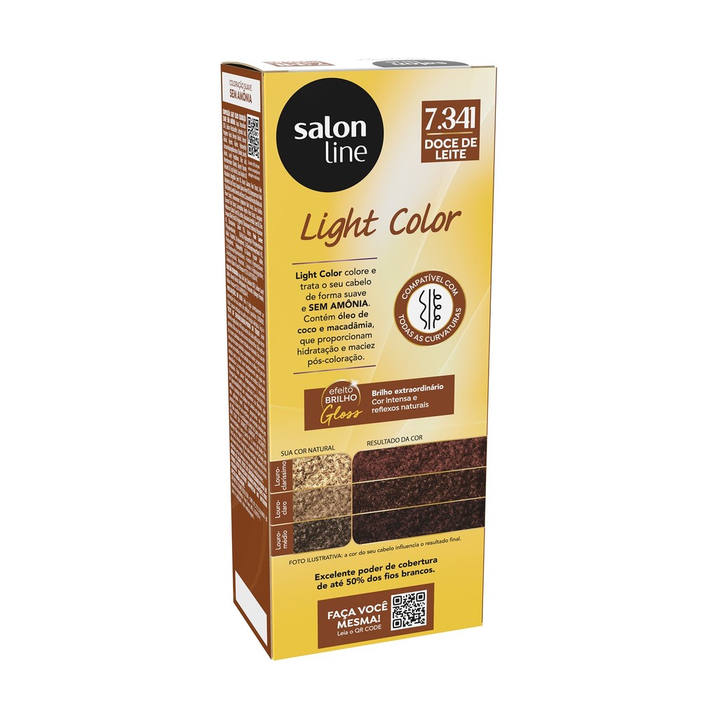Light Color Coloração 7.341 Doce de Leite garante cor intensa, proteção aos fios e brilho extraordinário. Coloração suave sem amônia. <>INDICAÇÕES$& Para quais tipos de cabelo? Para todas as curvaturas. Qual a indicação? Para todos os tipos de cabelo. Pode usar a partir de quantos anos? A partir de 12 anos. <>ATIVOS$& Quais os principais ativos? Óleo de coco: nutre o cabelo pós-coloração, além de fortalecer os fios e proporciona brilho e maciez extrema. Óleo de macadâmia: hidrata e nutre intensamente os fios. <>MODO DE USO$& Qual a melhor forma de usar? Confira o passo a passo e escolha a opção de aplicação mais apropriada para os seus cabelos: Preparação da mistura 1. Desembarace e molhe os cabelos com água, sem lavá-los. 2. Enxugue-os cuidadosamente. Caso os cabelos possuam resíduos de gel, mousse, etc ou estejam oleosos, lave-os com shampoo Salon Line. 3. Coloque as luvas. 4. Com um pincel, misture bem em um recipiente não metálico o conteúdo da bisnaga de coloração Light Color de 45g com 90ml de Emulsão Ativadora Salon Line até obter uma consistência homogênea e cremosa. 5. Utilize a mistura imediatamente e não guarde sobras. Aplicação/tempo de ação em cabelos naturais Aplique a mistura uniformemente nos cabelos mecha por mecha, na raiz, comprimento e pontas. Para cabelos finos, louros, avermelhados, permanentados, alisados e relaxados, deixe a mistura agir por 15 minutos. Para cabelos normais, grisalhos e escuros, deixe a mistura agir por 20 minutos. Aplicação/tempo de ação em aplicações subsequentes Aplique na raiz dos cabelos por 15 minutos e no comprimento e pontas somente nos últimos 5 minutos, totalizando o tempo de ação de 20 minutos. Enxágue Após o tempo de ação, enxágue abundantemente até que a água corra límpida. Não é necessário usar shampoo. Aplique o Condicionador Salon Line e deixe agir por 3 minutos. Enxágue abundantemente. Dicas de uso Antes de iniciar a aplicação, passe um pouco de creme hidratante na testa (próximo aos cabelos), orelhas e nuca para facilitar a retirada da coloração e evitar que a pigmentação manche sua pele. Salon Line recomenda Antes da aplicação da Coloração Light Color, é importante realizar o teste de sensibilidade e o teste de mecha para detectar possíveis reações adversas e determinar o tempo de aplicação do produto e o resultado da cor. Por isso, não deixe de conferir a bula que acompanha a Coloração Light Color. <>CARACTERÍSTICAS$& É produto vegano? A Light Color Coloração 7.341 Doce de Leite não é vegana. É liberado? A Light Color Coloração 7.341 Doce de Leite não é liberada.
