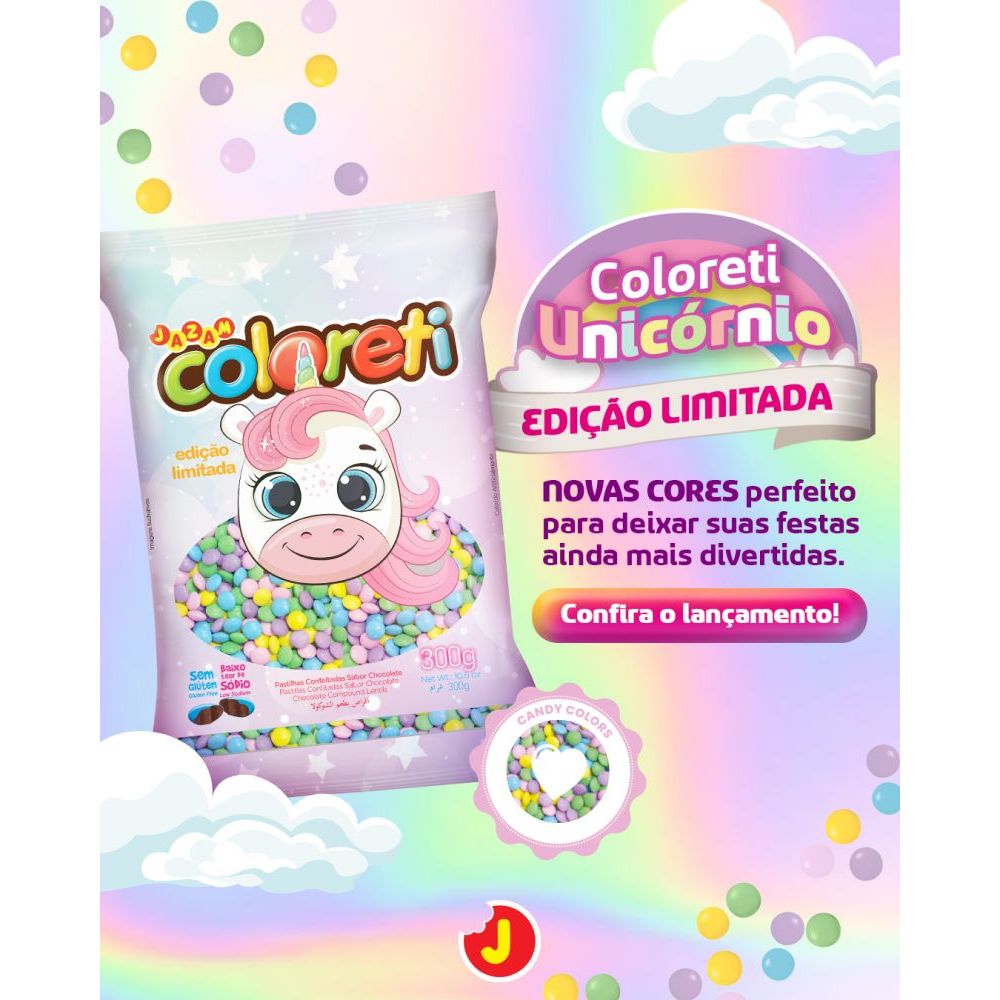 CONFEITO DE CHOCOLATE AO LEITE COLORETI UNICORNIO 300G JAZAM Pastilhas confeitadas e coloridas sabor chocolate, crocantes por fora e macias por dentro. Um produto saboroso e divertido, preferido pelas crianças e adolescentes. Ideal para colorir a sua festa e combinar com a decoração. Dica de uso: Enche 10 tubetes de 12,5cm de altura; 6 tubetes de 9,5cm e 19 latinhas de medidas 5,5x1,5cm.