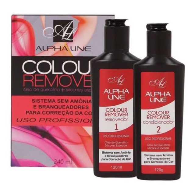 Colour Remover Removedor de Coloração Óleo de Queratina e Silicones Especiais 240ml - Alpha Line Alpha Line Colour Remover retira parcialmente ou totalmente a coloração indesejável dos cabelos de maneira prática e eficaz, sem modificar sua cor natural, pois não contém Amônia ou agentes descolorante. Colour Remover desenvolvido com Óleo de Queratina e Silicone especiais promove força e reparo á fibra capilar, não agride os fios e irá remover apenas os pigmentos artificiais deixando-os fortes saudáveis e macios. Sua Tecnologia em Amônia ou agentes descolorante permite a aplicação em cabelos quimicamente tratados, alisados, com escova progressiva, coloridos e com mechas. Modo de usar: Usar luvas adequadas. Em um recipiente plástico coloque 1 parte do REMOVEDOR COLOUR REMOVER N°01 para 1 parte do CONDICIONADOR COLOUR REMOVER N° 02, mistura com auxílio de uma espátula ou pincel de plástico até completa homogeneização. Divida o cabelo em mechas; Com auxilio de um pincel aplique a mistura mecha a mecha, nos cabelos secos, não precisam estar limpos; Respeite a distância de 1 cm de raiz. Deixe em pausa de 30 a 40 minutos após a aplicação; Não utilizar touca plástica, alumínio ou fonte de calor. Após a pausa lavar os cabelos com o Shampoo Neutro. IMPORTANTE: As colorações podem provocar uma reação alérgica que em alguns casos raros, pode ser grave. Para ajudar você a prevenir o risco de reação alérgica, é indispensável respeitar as seguintes precauções: Já apresentou alguma reação alérgica a um produto de coloração. O seu couro cabeludo está irritado ou lesionado. Fazer, em todos os casos, uma PROVA DE TOQUE (Teste de alergia Cutânea (Pele) Imperativamente 48 horas antes de cada utilização deste produto). As alergias podem aparecer de repente, mesmo que você já tenha utilizado anteriormente um produto de coloração deste ou outra marca. MS: 2.05135.0007 Nº Processo: 25351.562840/2017-93.
