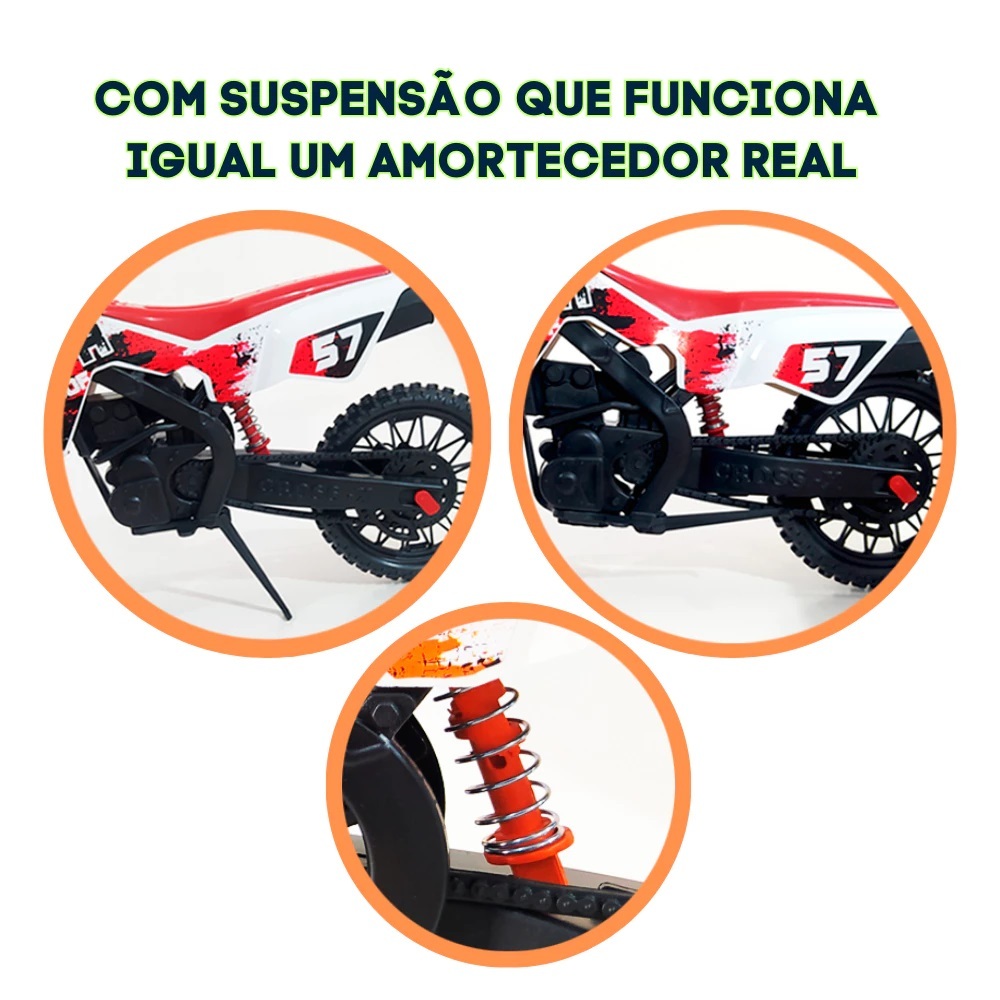 - Ela auxilia no desenvolvimento da coordenação motora, além da imaginação e criatividade. Suspensão com amortecedor e pézinho de descanso para a brincadeira ficar ainda mais divertida! Viva grandes emoções com a Mega Cross! Principais Características: Brinquedo Grande: Com 37 cm de altura e 23 cm de comprimento, esse brinquedo se destaca pela sua presença e realismo. Detalhes Realistas: Modelado com cuidado e precisão, esse brinquedo apresenta vários detalhes autênticos, inspirados no modelo CRF de motos de trilha. Suspensão Flexível: A traseira da moto sobe e desce com a suspensão flexível, permitindo uma experiência mais realista durante as brincadeiras. Descanso Funcional: A moto possui um descanso funcional, permitindo que ela fique em pé de forma estável. Rodas Livremente Giratórias: Ambas as rodas giram livremente, proporcionando movimento suave e dinâmico. Pneus de Trilha Detalhados: Os pneus são projetados com detalhes específicos para trilha, trazendo ainda mais autenticidade ao brinquedo. Guidão Móvel: O guidão se movimenta como em uma moto de verdade, permitindo que as crianças simulem manobras e direcionem a moto durante as brincadeiras. Farol Transparente: O farol em acrílico transparente adiciona um toque de realismo ao brinquedo. Protetores de Manete de Freio e Embreagem: Detalhes como os protetores de manete de freio e embreagem garantem maior fidelidade ao modelo real. Freios a Disco: A moto possui freios a disco nas duas rodas, tornando a experiência de pilotagem ainda mais autêntica. Cano de Descarga Duplo: Com um cano de descarga duplo, essa moto traz um visual ainda mais empolgante. Paralama Dianteiro Alto: O paralama dianteiro alto, característico de motos de trilha, completa o visual realista do brinquedo. Se você está em busca de um presente de alta qualidade e que desperte a imaginação das crianças, acaba de encontrar! A Moto de Trilha Realista é amada pela criançada e oferece uma experiência única de brincadeira. Com sua atenção aos detalhes e design impressionante, essa moto promete ser um sucesso entre os pequenos aventureiros. Proporcione momentos de diversão e emoção com esse brinquedo incrível!