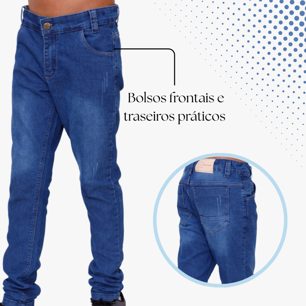 (COMBO) KIT COM 3 CALÇA JEANS MASCULINA INFANTIL O Kit com 3 Calças Jeans Infantil Masculina é ideal para quem busca praticidade, estilo e economia. As calças são pensadas para acompanhar o dia a dia dos meninos, seja na escola, no passeio com a família ou em momentos de lazer. Com modelagem moderna e confortável, são peças que unem versatilidade e durabilidade para qualquer ocasião. Com opções de cores e tamanhos que vestem crianças de 10 a 16 anos, esse kit é uma excelente escolha para compor o guarda-roupa infantil com estilo e funcionalidade. INFORMAÇÕES DO PRODUTO: • Kit com 3 calças jeans masculinas infantis • 98% algodão e 2% elastano • Cores variadas que combinam com diversos looks - Jeans claro, médio e escuro • Regulagem na cintura para melhor ajuste • Bolsos frontais e traseiros funcionais • Modelagem confortável ideal para crianças e adolescentes • Tamanhos disponíveis: 10, 12, 14 e 16 PERGUNTAS FREQUENTES: • Como escolher o tamanho certo do Kit de Calças Jeans Infantil? Utilize a tabela de medidas para verificar o tamanho mais adequado, considerando a cintura e o comprimento da calça. • Por que comprar o Kit 3 Calças Jeans Infantil Masculina? Além de ter excelente custo-benefício, as peças são confortáveis, resistentes e versáteis. Perfeitas para o dia a dia ou momentos especiais. • Como cuidar das Calças Jeans? Lave sempre do avesso, de preferência com água fria e sabão neutro. Evite o uso de alvejantes para preservar a cor e o tecido. EXPERIÊNCIA DE COMPRA Produto com envio rápido e seguro, ideal para quem precisa de agilidade. Qualidade garantida para vestir com conforto e estilo. Dê ao seu filho roupas que acompanhem a rotina com liberdade e durabilidade.