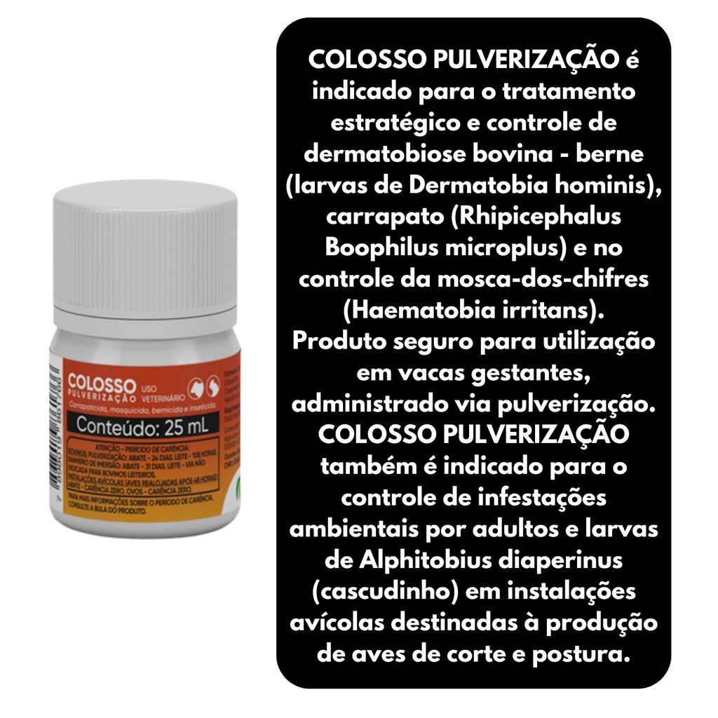 Colosso Pulverização é um produto ectoparasiticida que pode ser usado para combater parasitas em bovinos, suínos e aves. Ele pode ser aplicado por pulverização ou imersão. Descrição É um produto à base de Cipermetrina e Clorpirifós Combate carrapatos, bernes, moscas, piolhos e sarnas Controla o cascudinho e outras pragas de galpões avícolas Pode ser usado em pulverização ou banheiro de imersão Modo de uso Para pulverização, diluir o produto na proporção indicada na bula Aplicar a solução sobre todo o corpo do animal, especialmente as regiões mais infestadas Para imersão, pré-misturar o produto com água limpa em um balde Adicionar a solução ao tanque ou banheiro de imersão Homogeneizar bem Passar os animais pelo banheiro de forma individual Após a aplicação do Colosso Pulverização, é preciso respeitar os períodos de carência.