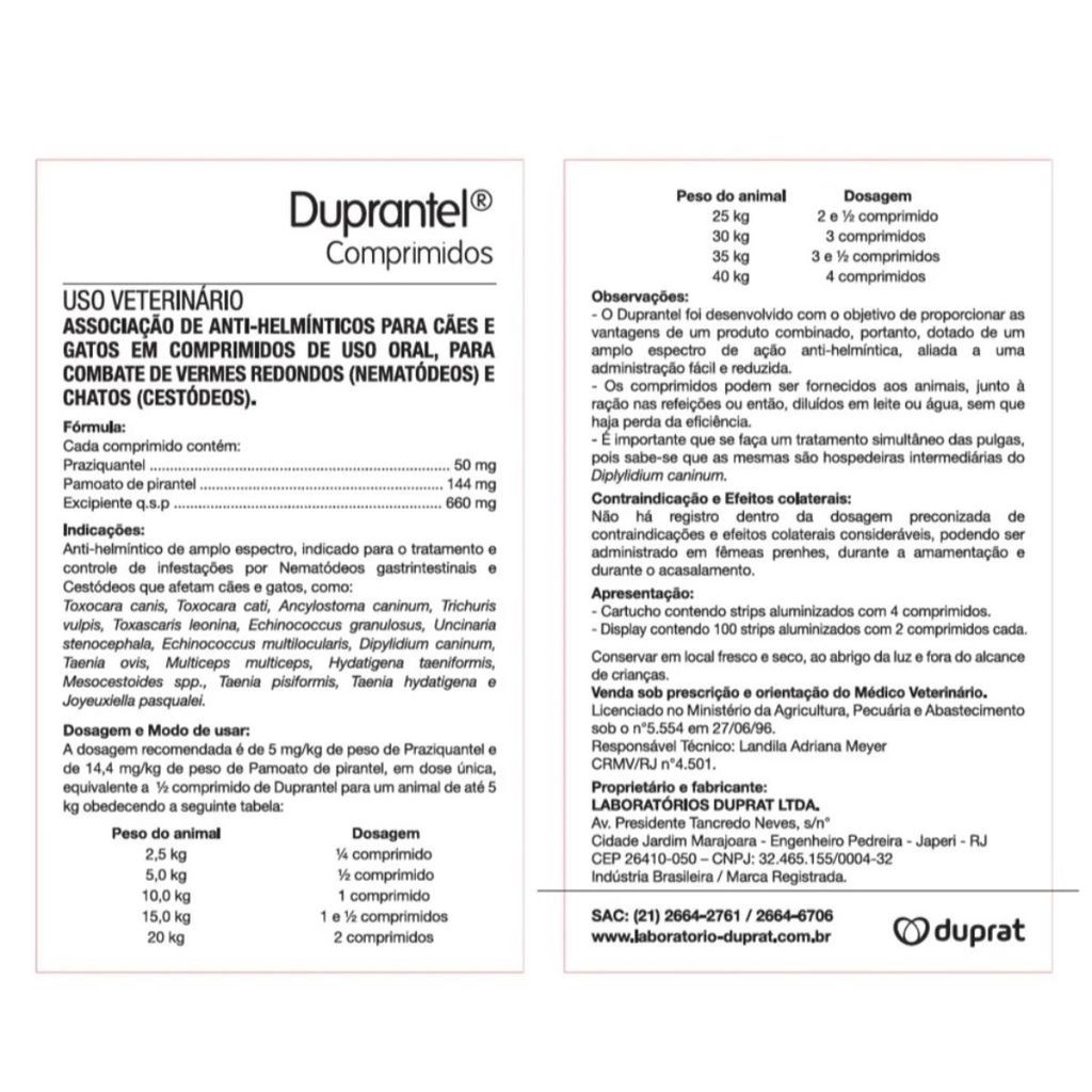 DESCRIÇÃO: Com com 4 Vermífugo Duprantel - 4 Comprimidos Duprantel: A Solução Completa para a Saúde Interna do Seu Pet! Cães e gatos livres de vermes? É com Duprantel! Duprantel é um vermífugo de amplo espectro, eficaz contra os principais tipos de vermes que podem acometer seus amigos peludos, tanto em filhotes quanto em adultos. Com Duprantel, você garante: Eficácia comprovada: Elimina até 99% dos vermes, incluindo nematoides, cestóides e protozoários. Ação rápida: Começa a agir em apenas 2 horas, proporcionando resultados rápidos e eficazes. Segurança para seu pet: Fórmula segura para filhotes a partir de 2 semanas de vida, fêmeas prenhes e lactantes. Fácil administração: Comprimidos saborosos que os animais aceitam facilmente. Prevenção contra reinfestações: Protege seu pet por até 3 meses. Duprantel é a escolha ideal para: Filhotes: Proteger contra vermes transmitidos pela mãe durante a gestação e amamentação. Animais adultos: Prevenir e tratar infestações por vermes intestinais e pulmonares. Animais que vivem em ambientes com outros animais: Reduzir o risco de reinfestações. Com Duprantel, você oferece ao seu pet: Mais saúde: Livre de vermes, seu pet terá mais disposição, energia e vitalidade. Melhor desenvolvimento: Filhotes livres de vermes crescerão mais saudáveis e fortes. Pelagem mais brilhante e macia: Indicador de um pet saudável e livre de parasitas. Menos riscos de doenças: A verminose pode levar a diversas doenças graves, que podem ser evitadas com a vermifugação regular. Posologia detalhada (Duprantel Plus/Geral): Até 2,5 kg: 1/4 de comprimido. 5,0 kg: 1/2 comprimido. 10,0 kg: 1 comprimido. 20,0 kg: 2 comprimidos. 30,0 kg: 3 comprimidos. 40,0 kg: 4 comprimidos. Pontos importantes: Cães: Comprimidos de 660mg ou 340mg (variável, verificar embalagem - comumente 10kg por comprimido). Gatos: Existe versão específica, mas a dosagem geral de 1 comp/10kg também se aplica a algumas versões. Uso: Oral, seguro para filhotes, adultos e sêniores. Recomenda-se sempre consultar um veterinário para confirmar a dose ideal. -------------------------------------------------------------------------------------------------------------------------------------------------- A MANADA ANIMAL é um marketplace de produtos veterinários. É a escolha certa para tutores que prezam pela qualidade dos produtos que seu animal necessita. Tudo com o suporte de uma equipe de veterinários e gestores com mais de 10 anos de experiência no mercado.Fique tranquilo, todos os nossos produtos são originais, adquiridos através de distribuidores credenciados!Ah, e todas as vendas acompanham nota fiscal!MANADA ANIMAL,Tranquilidade pra você, cuidado para ele!