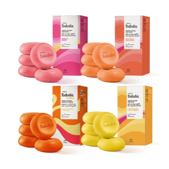CONSULTOR AUTORIZADO NATURA!!!! . Sobre o produto: NÃO É POSSÍVEL ESCOLHER NENHUMA FRAGRÂNCIA ELAS SÃO ALEATÓRIAS ( podendo ir também todas de uma só dependendo do estoque !) PRODUTO ORIGINAL O NATURA Os sabonetes em barra Tododia promove agradável sensação enquanto limpa e deixa a pele macia e sedosa. Sua fórmula suave evita o ressecamento e prepara a pele para um dia intendo. • Textura sedosa; • Realça o brilho natural da pele; • Para todos os tipos e tons de pele; • Fórmula com óleos nutritivos iluminadores. Conteúdo: 1 caixa com 5 unid 90g.