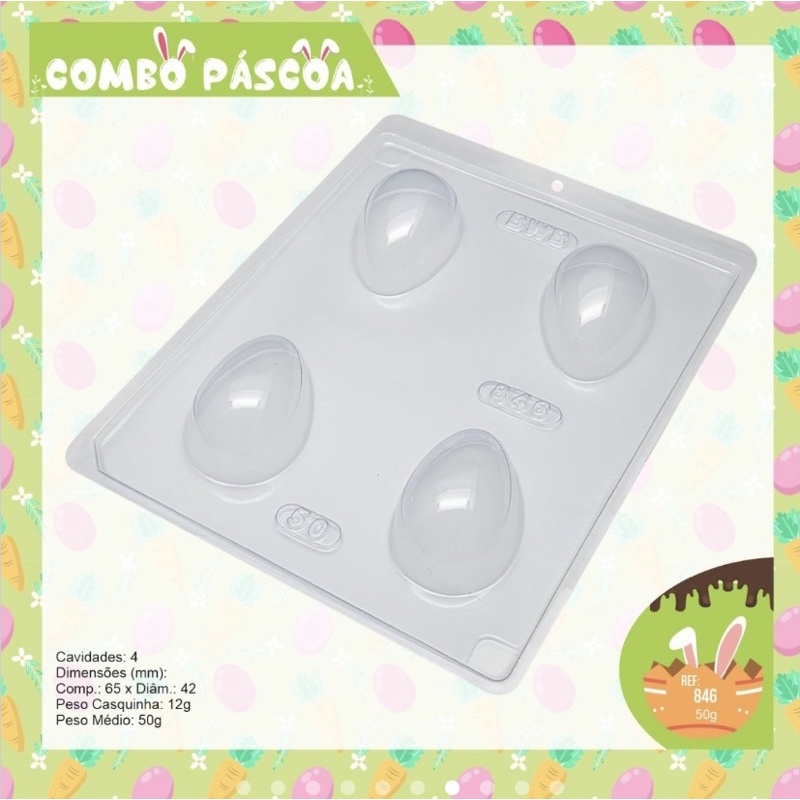 Combo 9 unidades de formas BWB Ovo Pascoa. CÓDIGOS: Cód. 48 - Ovo Liso 100g - Especial (3 Partes) Cód. 824 - Ovo Liso 150g - Especial (3 Partes) Cód. 49 - Ovo Liso 250g - Especial (3 Partes) Cód. 50 - Ovo Liso 350g - Especial (3 Partes) Cód. 51 - Ovo Liso 500g - Especial (3 Partes) Cód. 9454 - Ovo Liso 30g - Especial (3 Partes) Cód. 846 - Ovo Liso 50g- Especial (3 Partes) Cód. 3620 - SP 52 Ovo Liso 750g Especial (3 Partes) Cód. 3621 - SP 53 Ovo Liso 1kg Especial (3 Partes) 48 - Ovo Liso 100g - Especial (3 Partes) Cavidades: 2 Dimensões (cm): Comp.: 9,8 x Diâm.: 6,8 Peso Casquinha: 35g Peso Médio: 100g 824 - Ovo Liso 150g - Especial (3 Partes) Cavidades: 2 Dimensões (cm): Comp.: 10,9 x Diâm.: 7,0 Peso Casquinha: 55g Peso Médio: 150g 49 - Ovo Liso 250g - Especial (3 Partes) Cavidades: 1 Dimensões (cm): Comp.: 13,7 x Diâm.: 8,5 Peso Casquinha: 98g Peso Médio: 250g 50 - Ovo Liso 350g - Especial (3 Partes) Cavidades: 1 Dimensões (cm): Comp.: 15,1 x Diâm.: 9,0 Peso Casquinha: 155g Peso Médio: 350g 51 - Ovo Liso 500g - Especial (3 Partes) Cavidades: 1 Dimensões (cm): Comp.: 18,6 x Diâm.: 11,8 Peso Casquinha: 165g Peso Médio: 500g 9454 - Ovo Liso 30g - Especial (3 Partes) Cavidades: 6 Dimensões (cm): Comp.: 5,5 x Diâm.: 4,4 Peso Casquinha: 9g Peso Médio: 30g (Conjunto) 846 - Ovo Liso 50g- Especial (3 Partes) Cavidades: 4 Dimensões (cm): Comp.: 6,5 x Diâm.: 4,2 Peso Casquinha: 12g Peso Médio: 50g 3620 - SP 52 Ovo Liso 750g Especial (3 Partes) Cavidades: 1 Comp.: 19,7 x Diâm.: 13,0 Peso Casquinha: 230g Peso Médio: 750g 3621 - SP 53 Ovo Liso 1kg Especial (3 Partes) Cavidades: 1 Comp.: 20,9 x Diâm.: 15,0 Peso Casquinha: 310g Peso Médio: 1000g (1kg) Qualquer dúvida, faça uma pergunta ao vendedor!