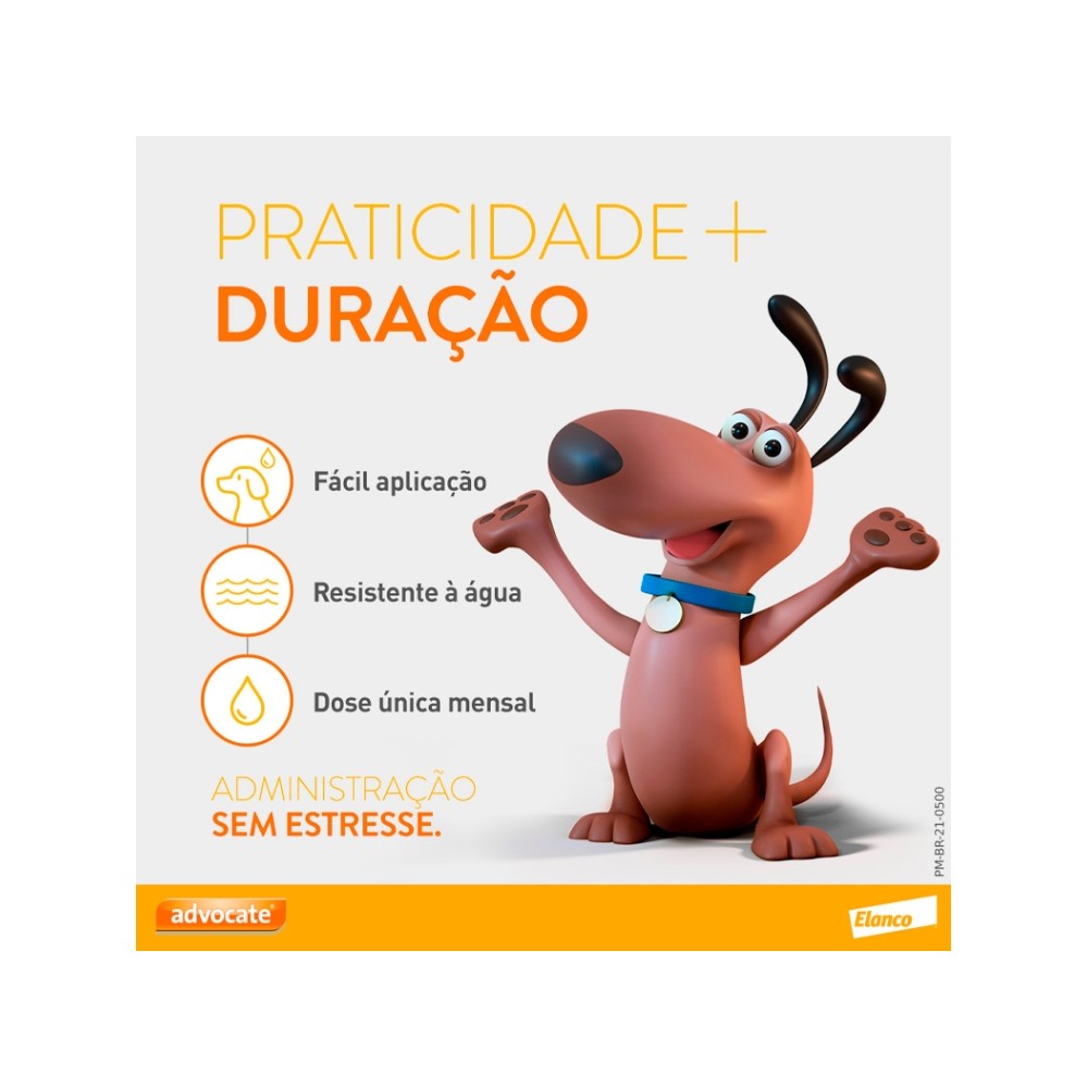 Validade: Agosto/2026 Advocate 10 a 25kg Combo 3 Pipetas em cada Caixa O Anti Pulgas Advocate Para Cães de 10 até 25 Kg é indicado para a prevenção e tratamento das infestações por pulgas, piolhos, ácaros das sarnas otodética, sarcóptica e demodécica e os vermes intestinais. Benefícios: - Ação imediata; - Proteção por quatro semanas; - Aplicação prática; - Pode ser aplicado logo após o banho; - Eficaz no tratamento contra pulgas, piolhos, ácaros das sarnas otodética, sarcóptica e demodécica e os vermes intestinais; - Previne a dirofilariose canina; - Elimina pulgas reinfestantes durante quatro semanas, devido a seu efeito residual; - Auxilia a desinfestação do ambiente; - Pode ser usado com tratamento a DAPP (Dermatite Alérgica à Picada de Pulgas). Composição Cada 1 mL contém: Imidacloprida............100 mg Moxidectina..............25 mg Veículo q.s.p............1 mL Como funciona: O conteúdo da bisnaga deve ser aplicado de acordo com o peso do cão na região da nuca do animal, afastando os pelos. Pode ser aplicado após o banho quando o pelo e a pele do animal estiverem secos.