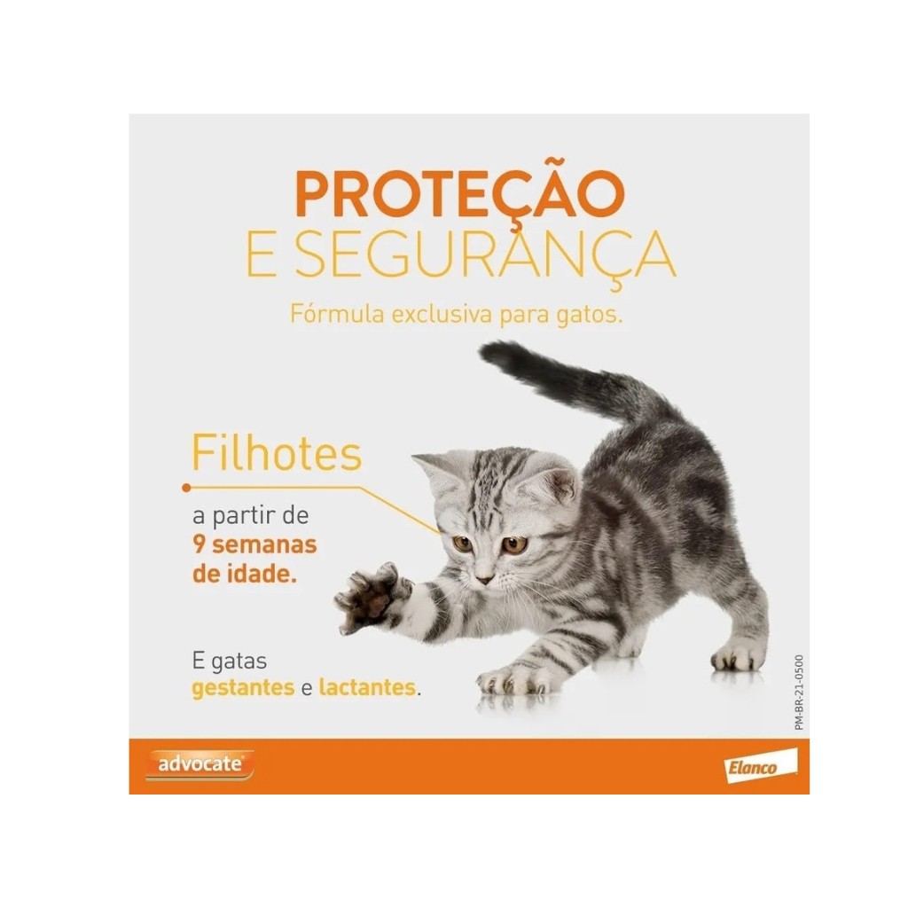 Validade: Maio/2026 Combo 3 Pipetas em cada Caixa Antipulgas Advocate para Gatos de até 4kg 0,4ml O Antipulgas Advocate Gatos até 4 kg é um antipulgas indicado para a prevenção e para o tratamento das infestações por pulgas, ácaros das sarnas otodécica e sarcóptica e até mesmo para vermes intestinais que afetam os felinos, podendo prevenir também a infestação causada pelo verme cardíaco. Modo de Uso: O antipulgas pode ser utilizado com segurança em gatos que pesem até 4 kg, incluindo as fêmeas que estejam em qualquer fase da gestação ou da lactação. Além disso, este medicamento também pode ser aplicado em gatos mais novos, que tenham a partir da 9ª semana de vida, e até mesmo nos gatos idosos. Para utilizar o produto é necessário dar banho e secar bem os pelos do animal. Depois que o pelo e a pele estiverem totalmente secos, é necessário aplicar o produto. É importante que o tutor tenha em mente que o produto tem um sabor amargo, por isso, pode acontecer salivação se os gatos lamberem o local da aplicação. Composição: Cada 1 mL contém: Imidacloprida........100 mg Moxidectina..........10 mg Veículo q.s.p........1 mL.