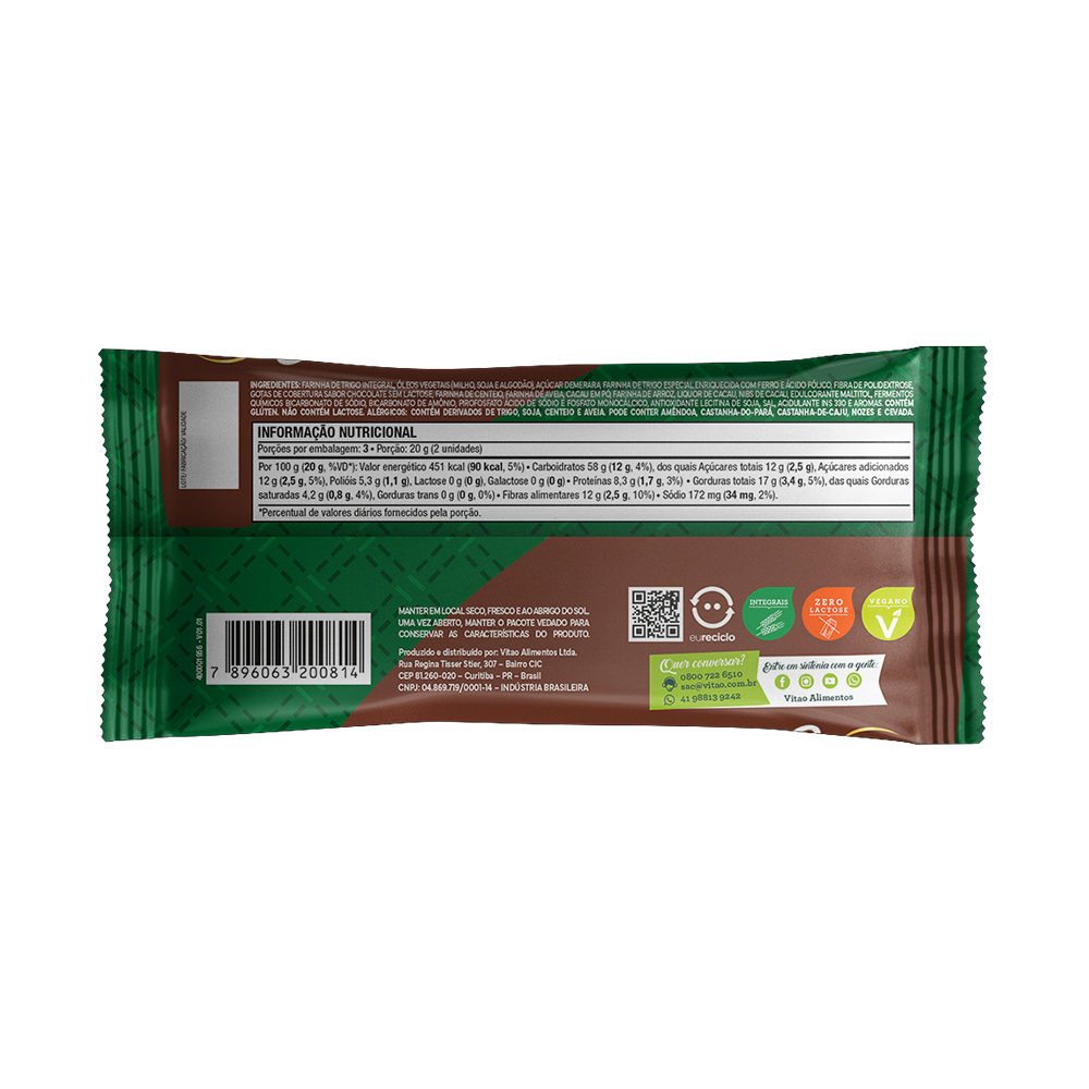 Este combo contém os seguintes produtos: - Cookies Tradicional Integral Vitao 60 g: INGREDIENTES: Farinha de trigo integral, óleos vegetais (milho, soja e algodão), açúcar demerara, gotas de cobertura sabor chocolate sem lactose, fibra de polidextrose, farinha de trigo especial enriquecida com ferro e ácido fólico, farinha de centeio, farinha de aveia, farinha de arroz, sal, edulcorantes maltitol e xarope de maltitol, fermentos químicos bicarbonato de sódio, bicarbonato de amônio, pirofosfato ácido de sódio e fosfato monocálcico, emulsificante lecitina de soja, acidulante ácido cítrico e aromas. ALÉRGICOS: CONTÉM DERIVADOS DE TRIGO, SOJA, CENTEIO E AVEIA. PODE CONTER AMÊNDOA, CASTANHA-DO-PARÁ, CASTANHA-DE-CAJU E CEVADA. CONTÉM GLÚTEN. NÃO CONTÉM LACTOSE. INTEGRAL, ZERO LACTOSE, VEGANO, FONTE DE FIBRAS. ______________________________________________________________________________________ - Cookies Chocolate Integral Vitao 60 g: INGREDIENTES: Farinha de trigo integral, óleos vegetais (milho, soja e algodão), açúcar demerara, farinha de trigo especial enriquecida com ferro e ácido fólico, fibra de polidextrose, gotas de cobertura sabor chocolate sem lactose, farinha de centeio, farinha de aveia, cacau em pó, farinha de arroz, liquor de cacau, nibs de cacau, edulcorante maltitol, fermentos químicos bicarbonato de sódio, bicarbonato de amônio, pirofosfato ácido de sódio e fosfato monocálcico, antioxidante lecitina de soja, sal, acidulante INS 330 e aromas. ALÉRGICOS: CONTÉM DERIVADOS DE TRIGO, SOJA, CENTEIO E AVEIA. PODE CONTER AMÊNDOA, CASTANHA-DO-PARÁ, CASTANHA-DE-CAJU, NOZES E CEVADA. CONTÉM GLÚTEN. NÃO CONTÉM LACTOSE. INTEGRAL, ZERO LACTOSE, VEGANO, FONTE DE FIBRAS.