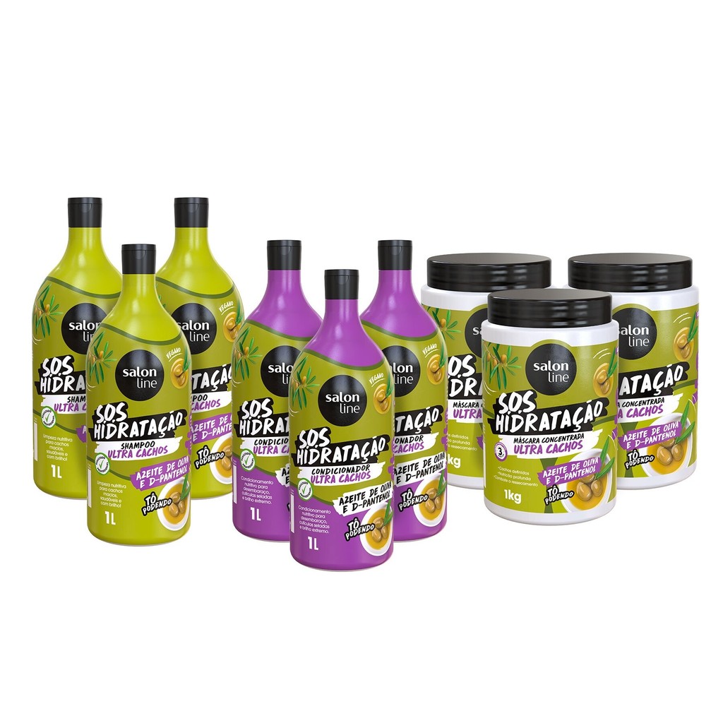 O Kit Combo Família Kit S.O.S Hidratação Ultra Cachos com Máscara de Hidratação contém 3 Shampoos, 3 Condicionadores e 3 Máscaras de Hidratação da linha S.O.S Hidratação Ultra Cachos. Combinados, garantem limpeza hidratante com nutrição, saúde, maciez, brilho e combate ao ressecamento. INDICAÇÕES Para quais tipos de cabelo? Cabelos cacheados e crespos. Qual a indicação? Cabelos ressecados, desnutridos e cabelos com frizz. Pode usar a partir de quantos anos? A partir de 12 anos. ATIVOS Quais os principais ativos? Shampoo, Condicionador e Máscara de Hidratação S.O.S Hidratação Ultra Cachos D-pantenol: proveniente da vitamina B12, proporciona hidratação profunda, melhora a textura das fibras capilares, diminui os cabelos com pontas duplas e garante mais força aos fios. Azeite de oliva: popularmente conhecido por seu forte poder de hidratação, o azeite de oliva é um antioxidante fundamental para combater o ressecamento dos cabelos. MODO DE USO Qual a melhor forma de usar? Shampoo S.O.S Hidratação Ultra Cachos: Aplique o Shampoo Salon Line 1 litro S.O.S Hidratação Ultra Cachos no cabelo úmido e massageie. Enxágue. Se necessário, repita a aplicação. Condicionador S.O.S Hidratação Ultra Cachos: Aplique o Condicionador S.O.S Hidratação Ultra Cachos Salon Line 1 Litro no cabelo úmido e massageie. Enxágue. Se necessário, repita a aplicação. Máscara de Hidratação S.O.S Hidratação Ultra Cachos: Após lavar os cabelos, retire o excesso de água e aplique a Máscara S.O.S Hidratação Ultra Cachos do comprimento até as pontas. Aguarde 3 minutos e enxágue. Finalize como desejar. CARACTERÍSTICAS É produto vegano? Os produtos são veganos. É liberado? Os produtos não são liberados.