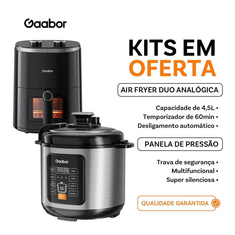 Fritadeira Elétrica Air Fryer Gaabor Duo Analógica Sem Óleo 4.2L 127V Preto - AF-45M02AS A Fritadeira Elétrica Air Fryer Gaabor Duo Analógica 4.2L é a escolha perfeita para quem busca praticidade e alimentação mais saudável no dia a dia. Com capacidade de 4,2 litros, ela permite preparar refeições saborosas para toda a família, utilizando pouco ou nenhum óleo. Além disso, o sistema de circulação de ar quente oferece um cozimento uniforme e crocante por fora, macio por dentro, sem abrir mão do sabor. Enquanto o design compacto e moderno na cor preta combina perfeitamente com qualquer ambiente de cozinha. Seu funcionamento silencioso e eficiente é ideal para quem busca agilidade sem comprometer o conforto da casa. Liberdade de criar receitas deliciosas com menos gordura e mais sabor. Com ela, você ganha tempo, saúde e praticidade, tudo em um só aparelho compacto e funcional. Especificações Marca Gaabor Modelo AF-45M02A/ AF-45M02AS Voltagem 127V Cor Preto / Inox Material PP e ABS Itens inclusos: Air Fryer Manual Livro de Receitas Potência 1350 W Frequencia 60Hz PLUG 20A Tamanho do Produto 245 x 338 x 315 mm Peso Líquido 3,05kg Painel Digital Não Antiderrapante Sim Desligamento Automático Sim Antiaderente Sim Com Visor Sim Detalhes do Produto Capacidade de 4,2L. Função de descongelamento. Materiais de alta qualidade. Livre de BPA. Temporizador Até 60 min. Temperatura: 80ºC - 200ºC Imagens de caráter ilustrativo. Informações divulgadas de acordo com o manual do fabricante. Produto novo na caixa, lacrado com NF e garantia do fabricante de 12 meses. Em caso de dúvidas sobre informações técnicas, utilização, limitações e manuseio do produto, verifique o manual do fabricante. #gaabor #fritadeiraairfryermondial #fritadeiraairfryer #tapeteparafritadeiraairfryer #tapeteparafritadeiraairfryer #fritadeiraairfryer220v #fritadeiraairfryer127v #bandejaparafritadeiraairfryer #cestodafritadeiraairfryer #gaabor