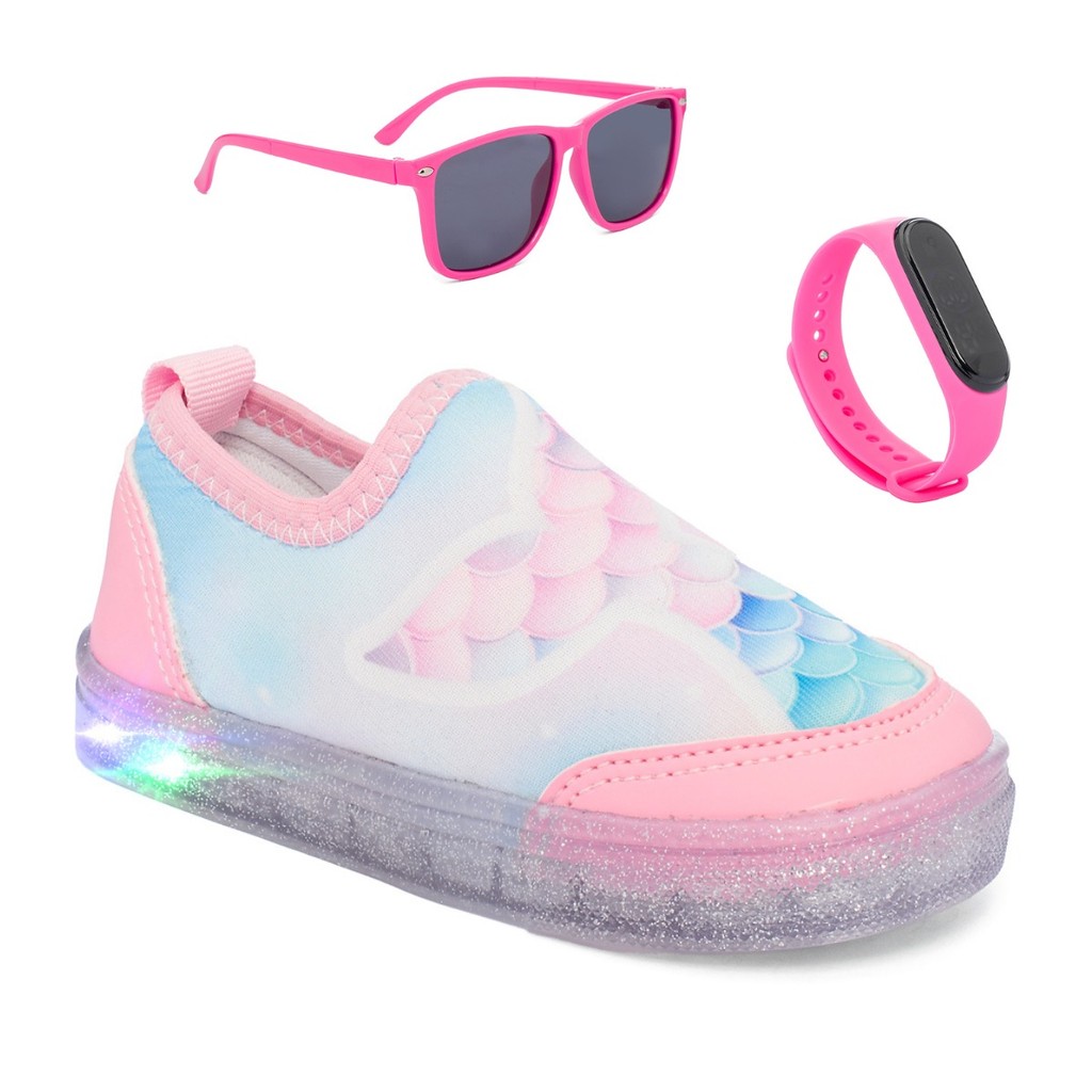 *********AVISOS DA FUNFY******** OS OCULOS SÃO ENVIADOS EM CORES SORTIDAS DE ACORDO COM NOSSO ESTOQUE. OS RELOGIOS SÃO ENVIADOS EM CORES SORTIDAS DE ACORDO COM NOSSO ESTOQUE. O TÊNIS É ENVIADO DE ACORDO COM A COR ESCOLHIDA NA VARIAÇÃO. EM CASO DE DEVOLUÇÃO, SÓ ACEITAMOS DEVOLUÇÕES DO KIT COMPLETO. NÃO É PERMITIDO DEVOLVER SOMENTE UM ITEM DO KIT. Combo Infantil Tenis Casual LED com Oculos e Relogio Menina Funfy. Esta procurando um "SUPER" conjunto pra sua princesinha, temos o combo perfeito. O Combo possui um Tênis em diversas estampas como sereia, arco e unicornio, além de contar com LED e o solado ser antiderrapante, garantindo maior segurança e conforto para as princesas. O Combo acompanha oculos e Relogio, o que deixa tudo mais alegre e estiloso. Indicado para o dia a dia, Escola, Passeio em família e muito mais diversão. Aqui na Funfy Kids você encontra o calçado ideal para todas as ocasiões A Funfy Kids trabalha com os materiais de alta qualidade, garantindo segurança e beleza as nossas pequenas. Especificações Detalhes Modelo Tenis LED + OCULOS + RELOGIO Material Externo Tecido Sintetico Material Interno Palmilha de Eva Solado Borracha Antiderrapante Detalhes Colorido Fecho Elastico Gênero Feminino Indicação Casual, Dia a Dia, Festas Características Leve, Confortável, Resistente Embalagem Caixa Marca Funfy