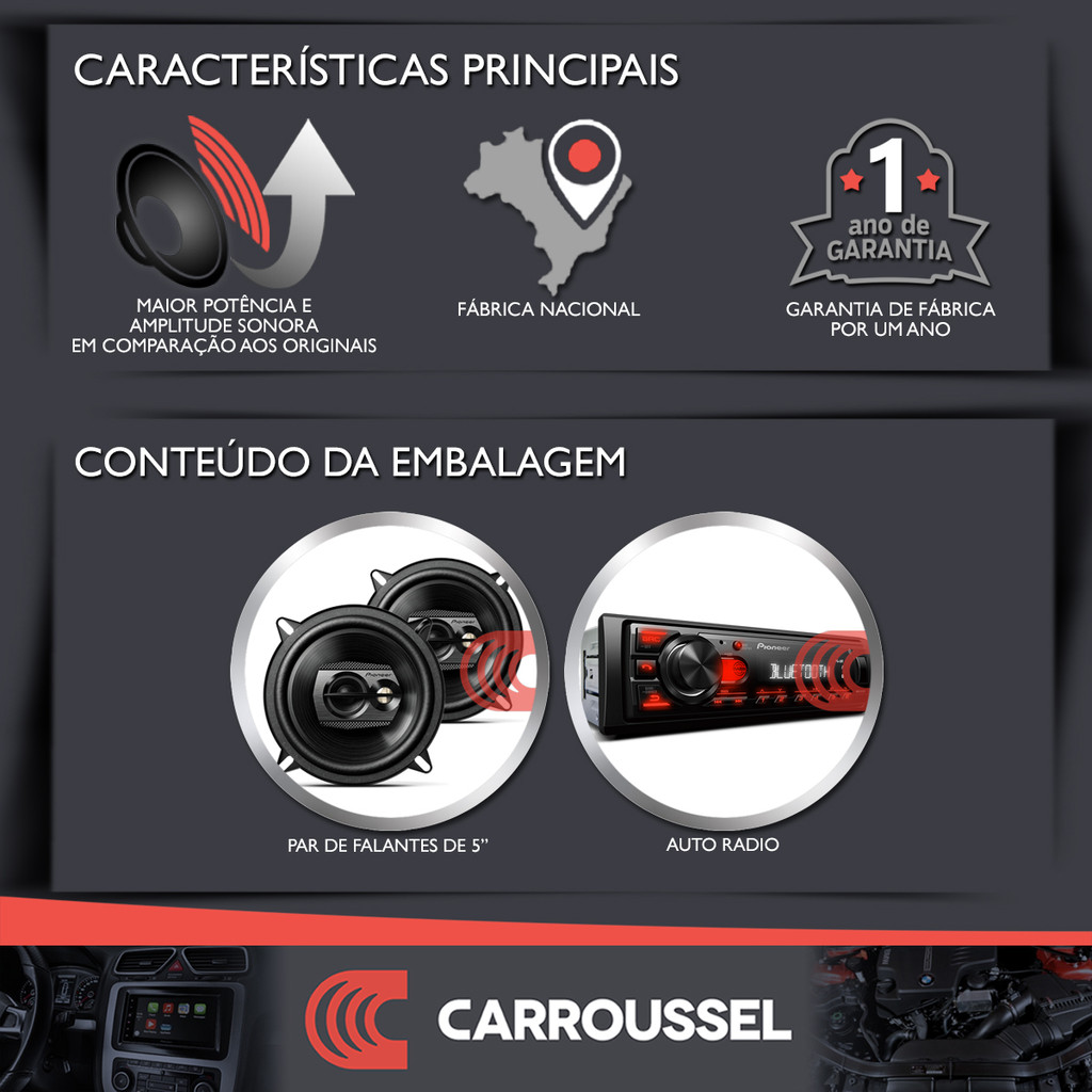 Carroussel Auto apresenta: Faça um upgrade no sistema de áudio de seu carro! #Conteúdo do kit pronto para instalação# - 1 Som Automotivo Pioneer MVH-S235BT - 1 Kit Alto-falante Triaxial 5 Polegadas Pioneer TS-1390BR (Par de falantes dianteiros) A Pioneer é uma das principais marcas de eletrônicos do planeta e utiliza a mais avançada tecnologia em seus produtos para que os consumidores possam desfrutar da máxima qualidade em áudio e vídeo que o mundo tem para oferecer. #INSTALAÇÃO# OBRIGATÓRIO INSTALAÇÃO EM UMA LOJA DE SOM E LIGAÇÃO NO PÓS-CHAVE CONFORME MANUAL E GARANTIA PIONEER ===================================================================== Som Automotivo Pioneer MVH-S235BT #TELA# - Visor LCD com 12 caracteres - Cor das letras do visor: Branco - Visor com relógio digital - Cor da iluminação dos botões: Vermelho - Dimmer para alterar o brilho do visor manualmente ou pelo horário - Botão Display OFF: um toque para desligar o visor #BLUETOOTH# - Bluetooth 5.0: streaming de áudio no carro e atendimento de chamadas viva-voz pelo microfone embutido #RÁDIO# - Captação de Rádios FM (76 a 108 MHz) - Memória para 18 estações - RDS para exibir as informações de texto que a estação de rádio transmite #ENTRADA WR e SWC# - Aceita comandos de volante (alguns carros precisam de interface de volante a ser adquirida separadamente) - Aceita controle de longa distância com compatibilidade WR e SWC (por exemplo: JFA Redline) #SOM# - 1 Par de saída de áudio Pré-Amplificada RCA (dir e esq) a 2V - Potência RMS: 4 canais de 23w cada. Totalizando 92wrms - Impedância: 4 Ohms a 8 Ohms - Volume máximo: 62 (recomendamos usar abaixo do máximo para evitar danos) - Botão Bass Boost: um toque para aumentar os graves do som - Equalizações predefinidas: Pop Rock, Eletronica, Samba, Forro, Sertanejo, Jazz, Flat, CUSTOM - Equalização CUSTOM: 5 bandas para personalizar (80Hz, 250Hz, 800Hz, 2,5kHz, 8kHz) entre -6 e +6 - Resposta de frequência: 50hz – 15khz - Crossover: FPA / FPB - Fader - Balance - Loudness - Bass Boost - HPF - SLA #NAVEGAÇÃO# - Muda e navega por pastas do USB - Modo de reprodução repetida ou aleatória #ESPECIFICAÇÕES TÉCNICAS# - Marca: Pioneer - Código fabricante: MVH-S235BT - Formatos de áudio suportados: WMA, MP3, WAV, FLAC - Fonte de Alimentação: 10,8V a 15,1V - Fusível: 10 A - Idioma: Português, Inglês e Espanhol - Garantia: 1 ano diretamente nos postos autorizados Pioneer - Fabricado na China - Importado pela Pioneer do Brasil - ANATEL: 01536-24-03270 #CONEXÕES FRONTAIS# - 1 entrada USB 2.0 a 0,5A #CONEXÕES POSTERIORES (TRASEIRA)# - 1 Par de saída de áudio Pré-Amplificada RCA (dir e esq) a 2V - 1 Entrada WR e SWC - 1 Entrada para o cabo de instalação (chicote) - 1 Entrada para antena de rádio #DIMENSÕES# - Medidas Padrão 1 DIN - Chassi: Largura 178mm x Altura 50mm x Profundidade 97mm - Face: Largura 170mm x Altura 46mm x Profundidade 17mm - Peso: 0,5 kg ===================================================================== Kit Alto-falante Triaxial 5 Polegadas Pioneer TS-1390BR (Par de falantes dianteiros) O TS-1390BR é o alto-falante triaxial de 5 polegadas para quem busca fidelidade de som e precisão nos médios e agudos. #PRINCIPAIS CARACTERÍSTICAS# - Cone IMPP (polipropileno moldado à injeção) projetado para reprodução equilibrada do vocal e graves proeminentes que oferece sons mais quentes, além de maior resistência a umidade presente em ambiente veicular - Tweeter piezoelétrico com diâmetro de 11mm em PET que reproduz as altas frequências com musicalidade - Midrange com conjunto magnético de neodímio - Midrange com diâmetro de 30mm com diafragma de policarbonato moldado - Suspensão boleada - Profundidade reduzida de instalação, que facilita a sua adequação a uma grande variedade de veículos #ESPECIFICAÇÕES TÉCNICAS# - Marca: Pioneer - Linha: TS - Alto-falante: Ø128 mm (5” Diâmetro) - Profundidade de Montagem: 49mm - Dimensões para Corte: Ø121mm - Potência RMS nominal: 120 W (60wrms por falante) - Impedância nominal: 4 ohms - Sensibilidade: 85 dB - Resposta em frequência: 50Hz a 20.000Hz ===================================================================== #GARANTIA# - Garantia: 1 ano diretamente nos postos autorizados Pioneer #OBSERVAÇÕES# - NÃO acompanha moldura - NÃO possui controle remoto - NÃO acompanha o celular, foto meramente ilustrativa - NÃO acompanha o chaveiro, foto meramente decorativa - Leve esse produto para ser instalado em uma empresa especializada para evitar perder a garantia por erros na instalação