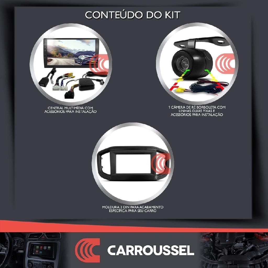 Carroussel Auto apresenta: Seu carro merece mais tecnologia com um kit multimídia+câmera+moldura! #APLICAÇÃO# - FIAT NOVA STRADA: 2021, 2022, 2023 e 2024 Para mais detalhes sobre compatibilidade consulte a(s) foto(s) "APLICAÇÃO" #CONTEÚDO DO KIT# - 1 Central Multimídia - 1 Câmera de Ré Borboleta com Linhas Guias Fixas - 1 Moldura 2 din para acabamento na cor preto* ==================================================================== A multimídia conta com sistema operacional Android que já possui os aplicativos Maps, Waze, Spotify e YouTube; e que permite a instalação de aplicativos pela Play Store. Ela dispõe de conexão Wi-fi, então você roteando a internet do celular navega pela internet na multimídia, baixa aplicativos e faz nela tudo o que faz no celular! E com a câmera de ré você evita acidentes executando manobras com muito mais segurança. ==================================================================== #MULTIMÍDIA# - Tela de 9" Full Touch Capacitiva de Vidro com LCD em LED - 7 opções de cores nos botões laterais - Algumas opções de logotipos de montadoras na inicialização - Saída para Tela Extra (Encosto de Cabeça) - Entrada para câmera de ré - Entrada USB traseira - Muda e navega por pastas do USB - Reprodução de áudio, vídeo e imagens - Conectividade Bluetooth: streaming de áudio no carro e atendimento de chamadas viva-voz pelo microfone embutido - Espelhamento via cabo de celular Android a partir da versão 5.0 - Espelhamento via cabo de celular IOS a partir do 4 - Conexão via cabo AndroidAuto - Conexão via cabo ClarPlay - Rádio FM - GPS integrado (mapas à parte) - Conexão a redes wi-fi - Sistema operacional Android - Processador Quad Core - 1 GB de memória RAM - 16 GB de HD (armazenamento interno) - Potência: 4 canais de 60W RMS cada - Acompanha 2 fios SWC para comando de volante com até 10 funções, para seu funcionamento alguns carros precisam de interface de volante a ser adquirida separadamente ==================================================================== #CÂMERA# - Imagem nítida e colorida com resolução de 420p - Ângulo de Visão: 120° vertical e 170° horizontal - Visão noturna: não tem infravermelho, mas é possível enxergar à noite dependendo da iluminação externa - Linhas guias de estacionamento fixas, ou seja, não acompanham o movimento do volante - Instalação pelo suporte borboleta ==================================================================== #OBSERVAÇÕES# - Garantia de fábrica: 90 dias - Leve esse produto para ser instalado em uma empresa especializada para evitar perder a garantia por erros na instalação - Não acompanha o chaveiro, foto meramente decorativa *É possível ocorrer alguma diferença de cor com em relação ao painel devido à ação do tempo e exposição do veículo ao sol.